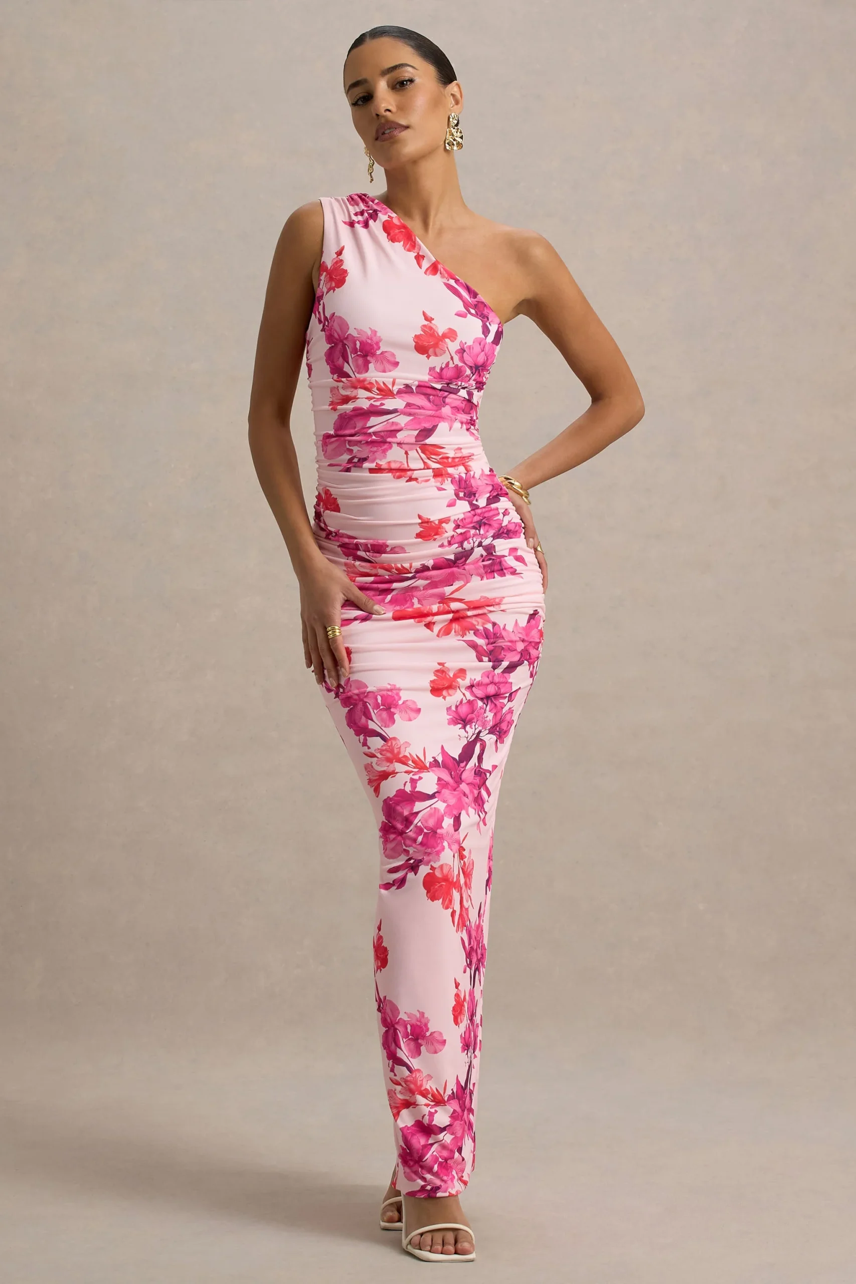 Una prenda esencial en tu guardarropa, cautiva desde todos los ángulos con Dalarie. Diseñada en nuestro jersey de doble capa, reconocido por sus capacidades moldeadoras, este vestido largo con estampado floral en tonos rosa y naranja se realza aún más con fruncidos en todo el cuerpo. Complementa su escote asimétrico con un sencillo y elegante moño y unos pendientes brillantes para tu próxima noche de cita.