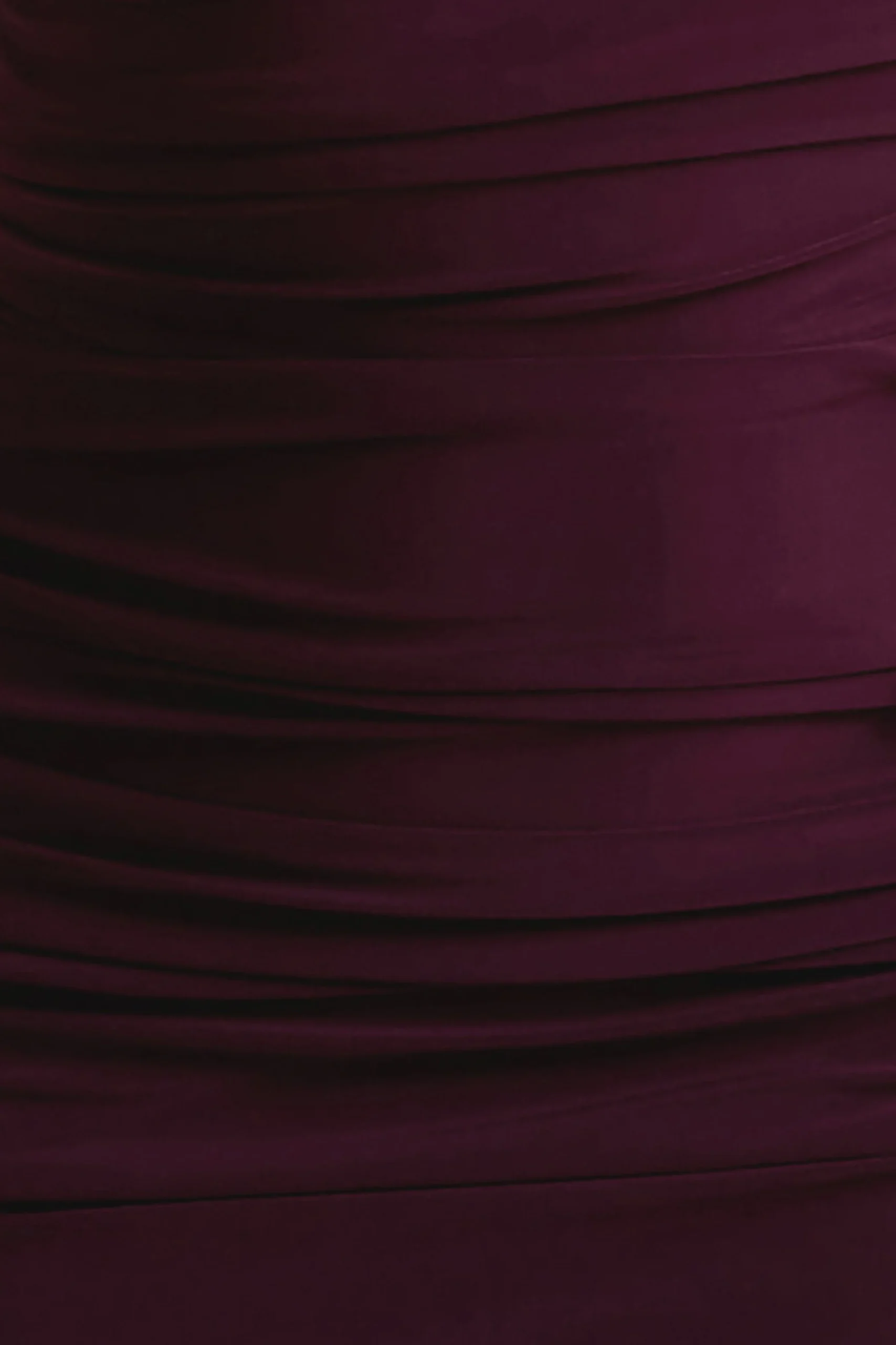 Un básico esencial en tu guardarropa, Dalarie te cautivará desde todos los ángulos. Diseñado en nuestro jersey de doble capa, conocido por sus capacidades de escultura, este vestido maxi en color port se realza aún más con fruncidos en todo el cuerpo. Complementa su escote asimétrico con un sencillo moño elegante y unos pendientes brillantes para tu próxima cita.