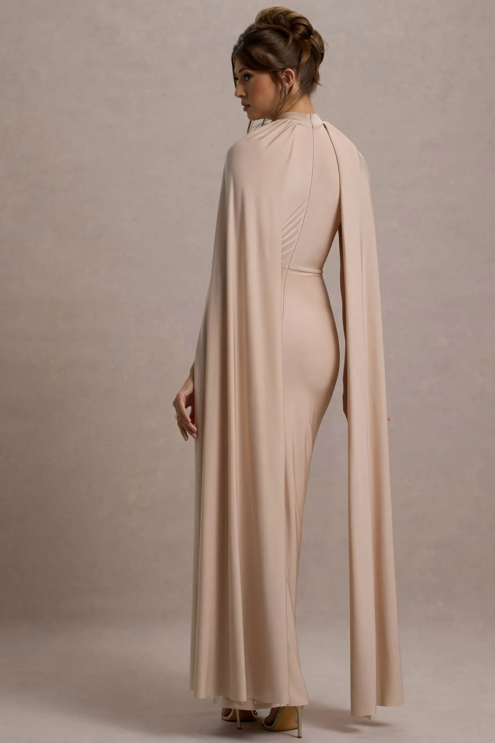 Diseñado para eventos especiales, elige la opulencia con Darielle. Llegando en un tono champán de un lujoso jersey disco, este vestido que roba miradas presenta un discreto escote alto, un corsé recogido y mangas capa exageradas.