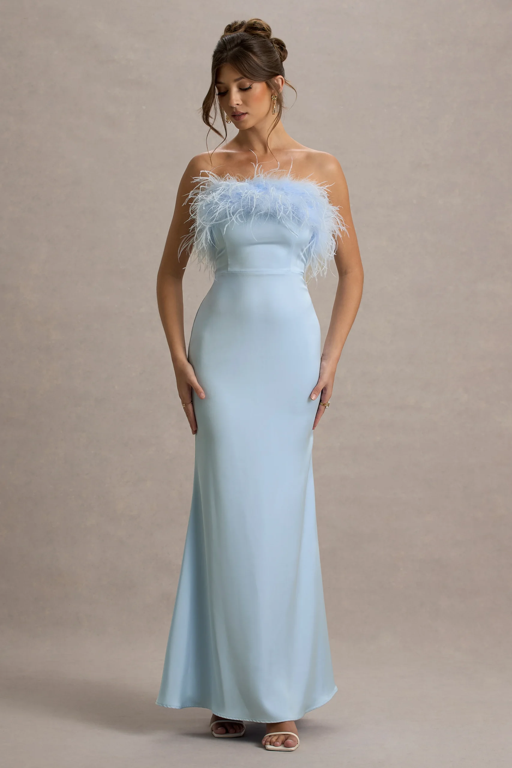 Es el comienzo de la temporada de eventos y necesitas Dress For It. Este glamuroso vestido ha sido confeccionado en un atemporal tono azul empolvado de satén premium, con un escote palabra de honor adornado con suaves plumas, creando el atuendo perfecto para eventos de etiqueta.