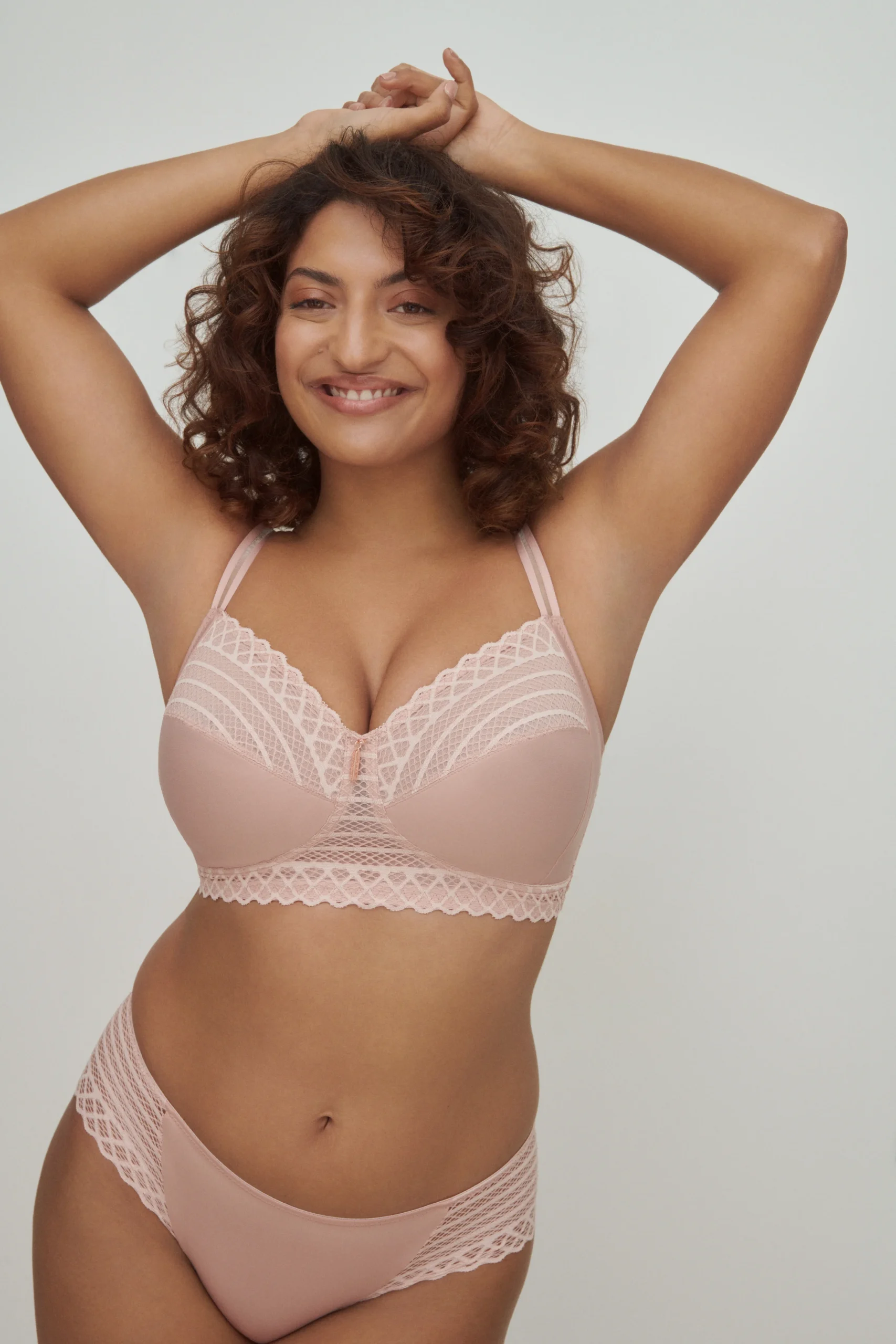PrimaDonna Twist East End no solo enamora por su aspecto. Las copas lisas y los detalles de encaje geométrico de esta lencería permiten llevarla debajo de todos tus atuendos. Muy cómodo y muy seductor. Powder Rose es un tono nude rosa claro. Muy bello debajo de la ropa de verano clara.