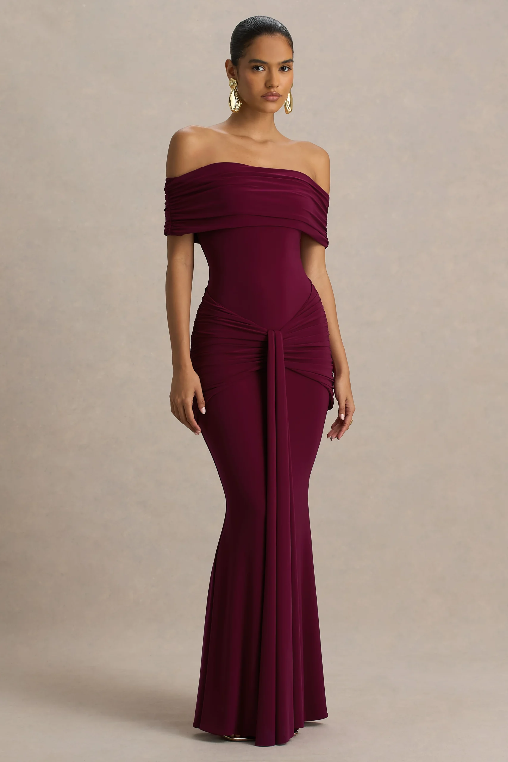 Brilla en tu momento estelar con Envisioned, una interpretación dramática de la elegancia clásica de noche. Confeccionado en nuestro jersey elástico premium de efecto moldeador en un burdeos atemporal, este vestido maxi favorece y define la silueta con cada movimiento. Enmarcado por un escote bardot, Envisioned presenta detalles fruncidos en la cintura y caderas para realzar la figura. Un llamativo lazo cae suavemente desde el centro del frente, aportando movimiento fluido y un toque de sofisticación a esta silueta elegante. Largo hasta el suelo y perfecto, este vestido está hecho para entradas inolvidables.