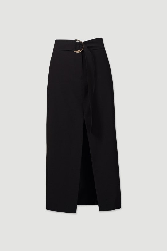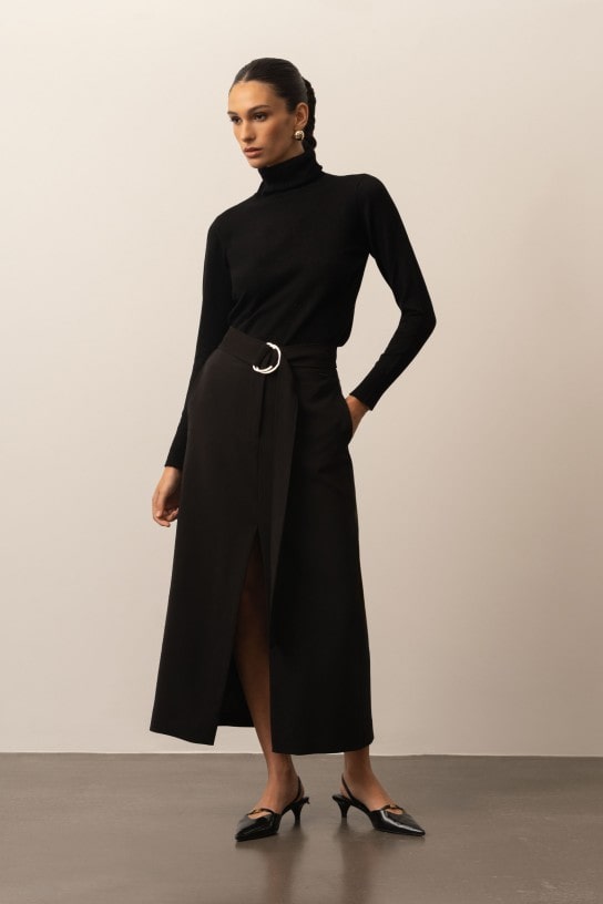 Falda midi con diseño elegante y práctico, que incluye una abertura delantera para mayor comodidad de Ferrache en color negro. Presenta bolsillos laterales funcionales y un cinturón desmontable con detalle dorado personalizado, ajustado en la parte trasera con dos botones. Su cierre frontal con cremallera y fuelle interior asegura un ajuste perfecto, haciendo de esta falda una prenda versátil y moderna ideal para cualquier ocasión.