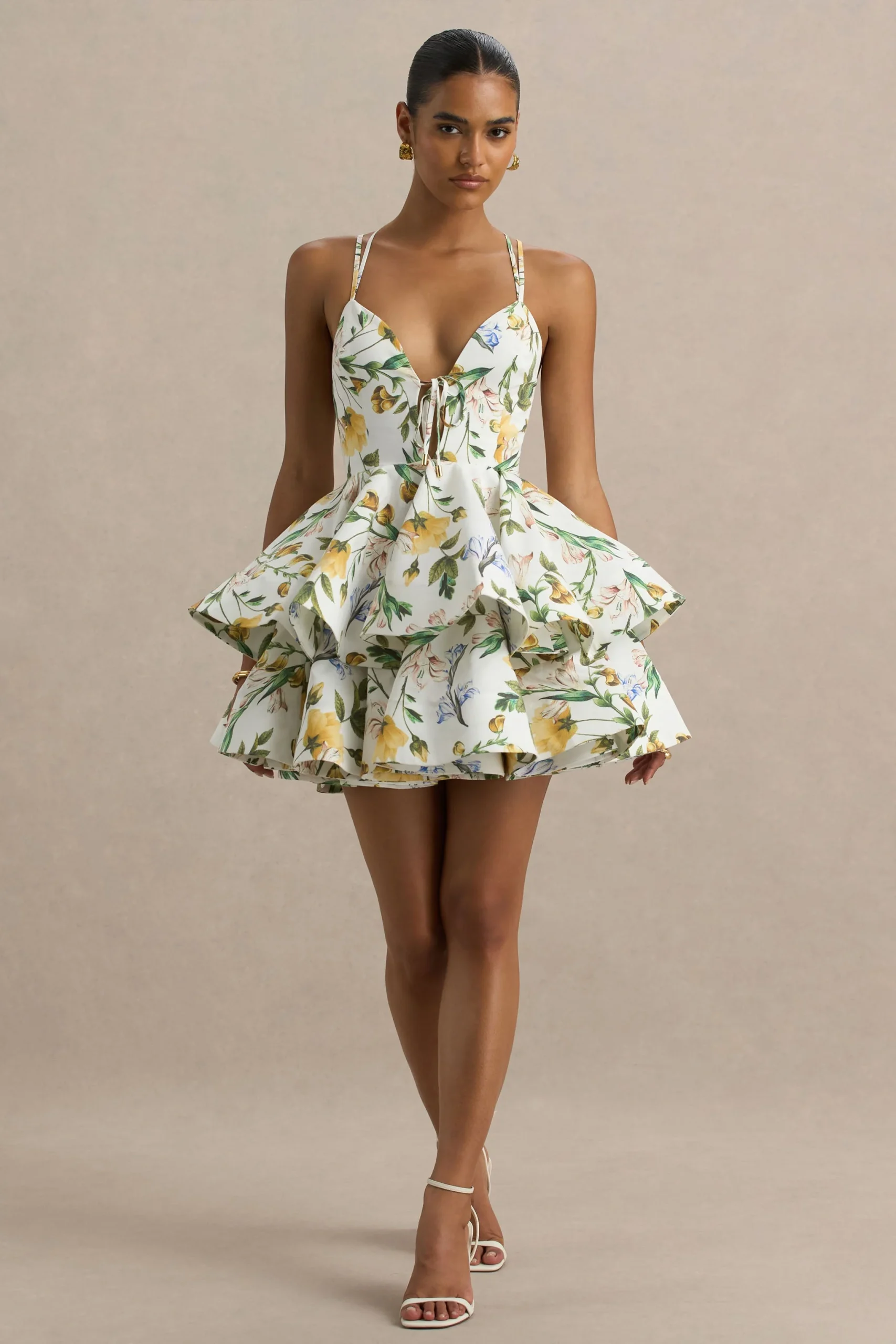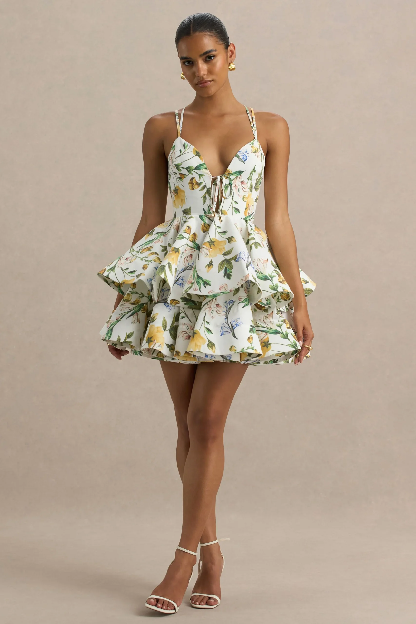 El vestido de verano definitivo con un toque seductor. Confeccionado en nuestro lino premium, en un romántico estampado botánico blanco, este mini está hecho para disfrutar del sol. Con un escote pronunciado y un detalle de espalda abierta con lazo, esta prenda es coqueta y sofisticada. Rematado con una falda con volantes que aporta un toque dramático y movimiento sin esfuerzo. El vestido perfecto para ocasiones especiales al sol, combinado con tacones de tiras y ondas playeras en el cabello.