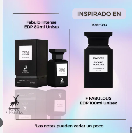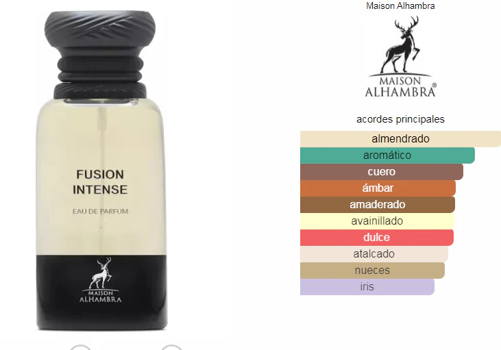 Fusion Intense de Maison Alhambra es una fragancia de la familia olfativa Cuero para Hombres y Mujeres. Esta fragrancia es nueva. Fusion Intense se lanzó en 2024. Las Notas de Salida son lavanda y esclarea; las Notas de Corazón son almendra amarga, cuero, iris y vainilla; las Notas de Fondo son cuero, haba tonka, maderas blancas, cachemira y ámbar. DUPE DE TOM FORD FUCKING FABULOUSE