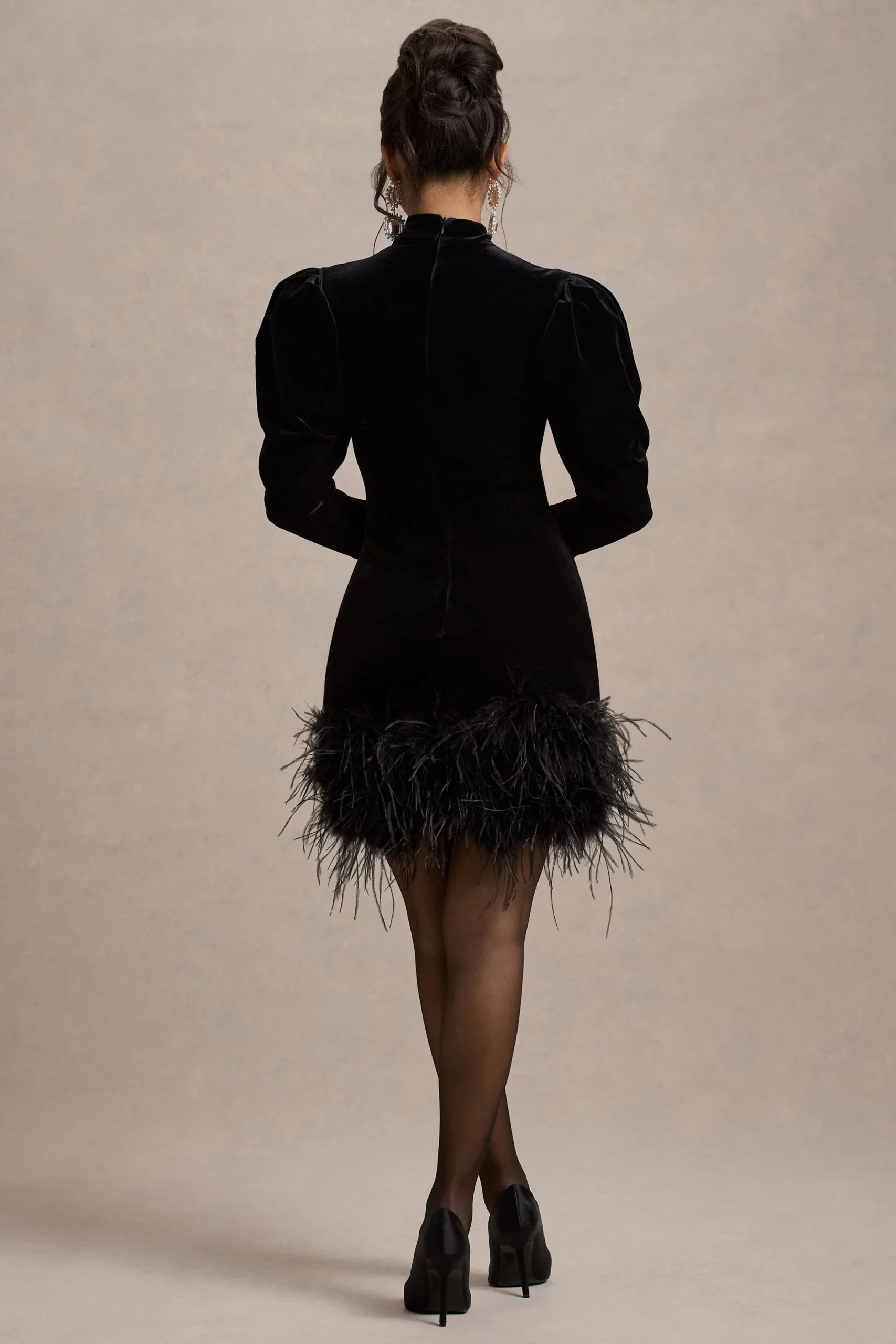 Con un encanto juguetón, dale la bienvenida a nuestro mini listo para fiesta, Issa. Confeccionado en una silueta ceñida de nuestro terciopelo negro premium, este mini presenta un clásico escote alto, mangas abullonadas y un extravagante dobladillo de plumas. Para el conjunto perfecto de cumpleaños, combínalo con unos pendientes brillantes como los Sovran.