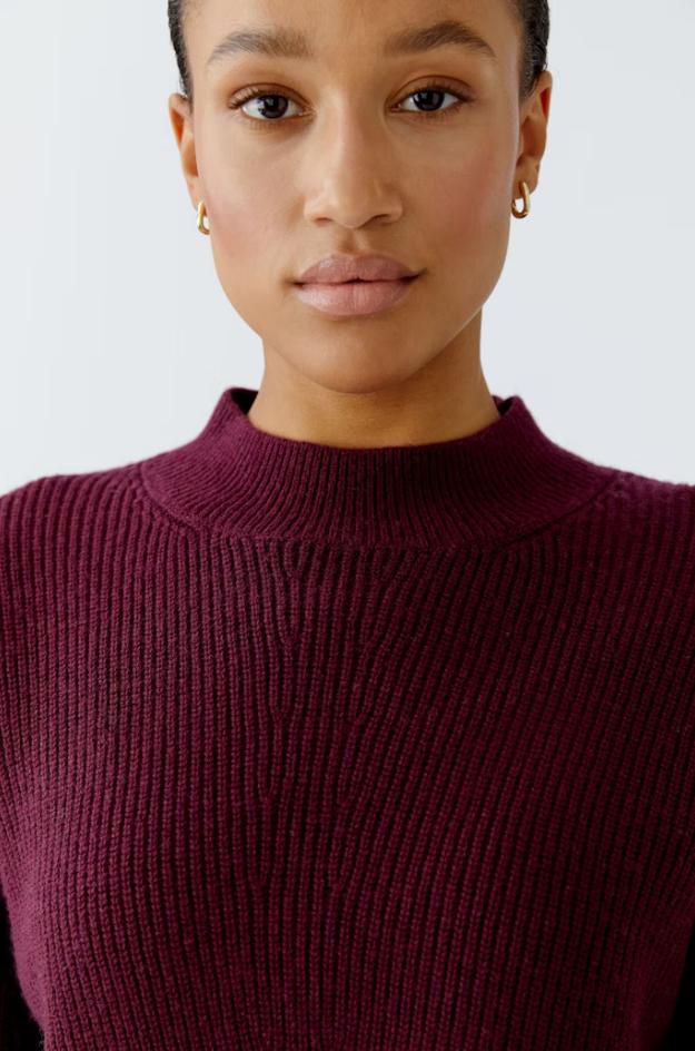 Jersey de Ouí confeccionado en mezcla de lana con modal y punto de canalé. Presenta corte amplio/oversize con longitud acortada y una construcción con disminuciones centradas delante y detrás que reducen el volumen hacia el bajo. Cuello redondo rematado en canalé alto, hombro muy caído y manga 7/8 con puños de canalé altos; todos los acabados de canalé están reforzados con elastano para mantener la forma. Longitud de referencia: 50 cm para la talla 36.