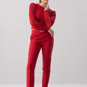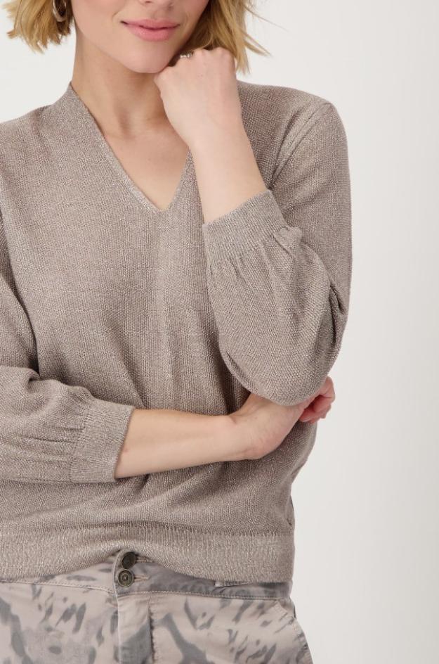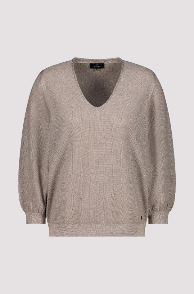 El suéter de punto impresiona por su elegante patrón de grano de arroz y la mezcla de viscosa con lurex brillante. Un clásico atemporal con escote en V y mangas ¾.