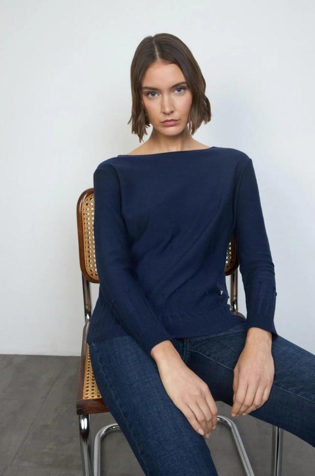 Jersey de Tinta & Bariloche confeccionado en un punto de mezcla suave (50% viscosa, 31% poliéster, 19% poliamida). Presenta escote redondo de línea limpia, manga larga y corte recto con caída confortable. Los puños y el bajo incorporan canalé ancho con motivos de punto en relieve que aportan textura. Terminaciones pulidas y costuras discretas. Disponible en dos colores lisos: azul marino y camel. Diseñado y fabricado en España.
