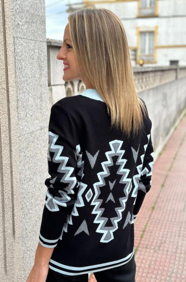 Jersey Passioni confeccionado en punto fino con mezcla de viscosa, poliamida y poliéster. Presenta diseño geométrico jacquard en contraste de tonos negro y azul hielo, con dibujo central de inspiración étnica. Incorpora cuello redondo, manga larga y remates en bajo y puños con franjas coordinadas. Su silueta recta y tejido elástico garantizan comodidad y una caída elegante. Una prenda de estética moderna y cuidada, perfecta para combinar con jeans o pantalones de vestir.