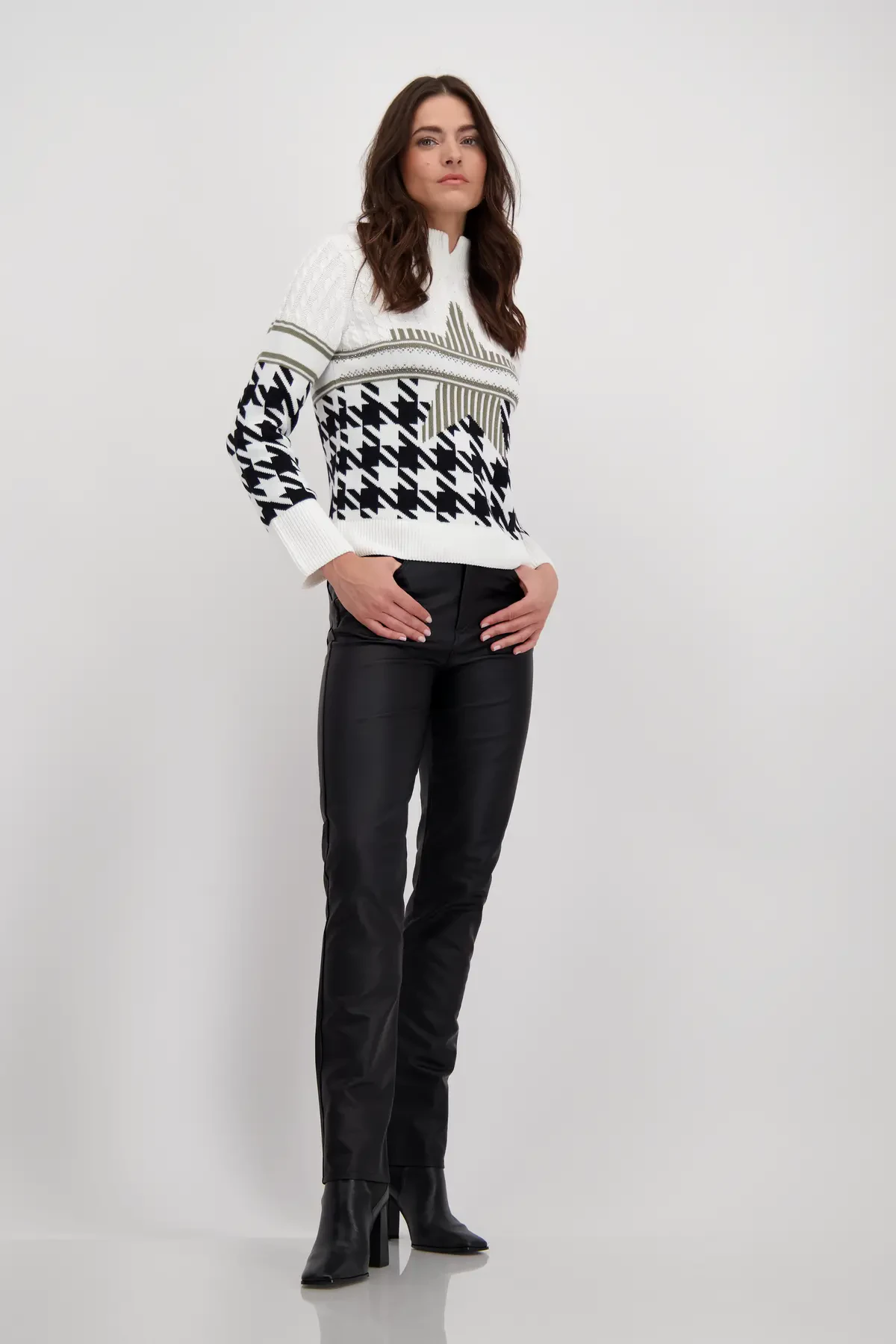 Jersey de punto de Monari con tejido jacquard y ochos. Color blanco con diseño de pata de gallo y estrellas en verde y negro, decorado con pedrería en la parte delantera y trasera. Con ajuste regular, cuello subido con pequeña abertura, mangas largas con puños anchos y acabado acanalado en mangas y dobladillo.