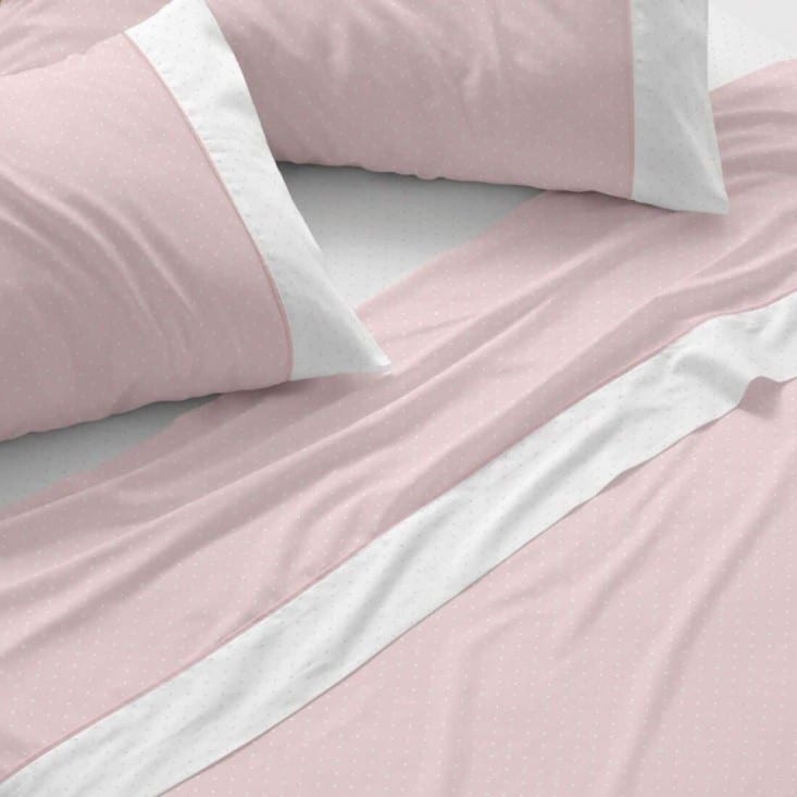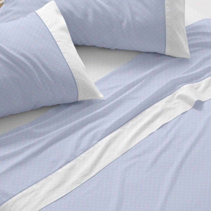 El juego de sábanas está compuesto por tres piezas: una sábana encimera, una sábana bajera ajustable y una o dos fundas de almohada, dependiendo del tamaño elegido. Tanto la sábana encimera como las bocas de la funda de almohada están adornadas con una elegante aplicación de tejido blanco con topitos y ribete a juego, aportando un toque distintivo y decorativo. La sábana bajera ajustable, fabricada en el mismo tejido, se adapta perfectamente a colchones de hasta 32 centímetros de altura, garantizando un ajuste cómodo y seguro.