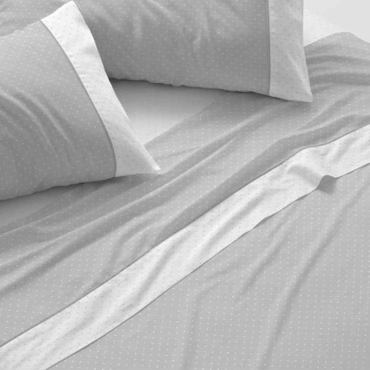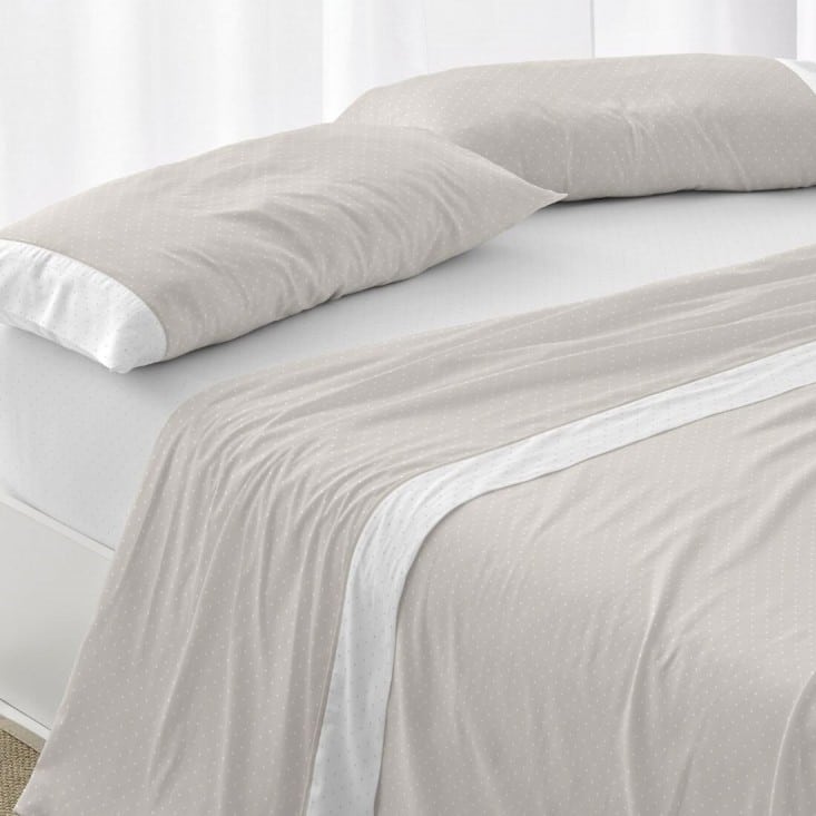 El Juego de Sábanas de Topitos Burrito Blanco 238 combina elegancia y comodidad con un diseño de pequeños topitos, disponible en cuatro colores modernos: Azul, Beige, Gris y Rosa. Este conjunto juega con el efecto de positivo-negativo, alternando entre topitos blancos sobre fondo de color o topitos de color sobre fondo blanco, creando un estilo único que encaja perfectamente con cualquier tipo de decoración de dormitorio.