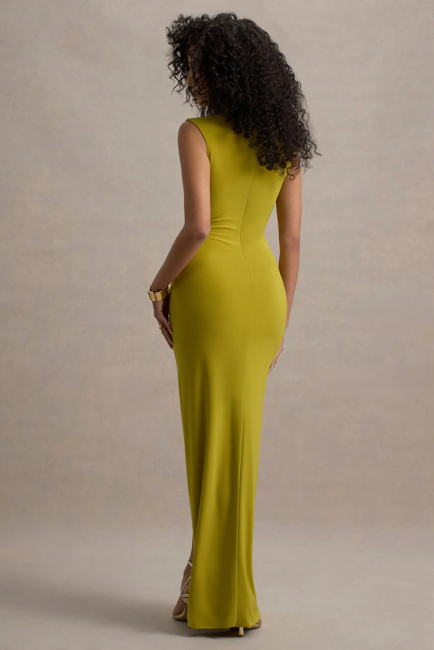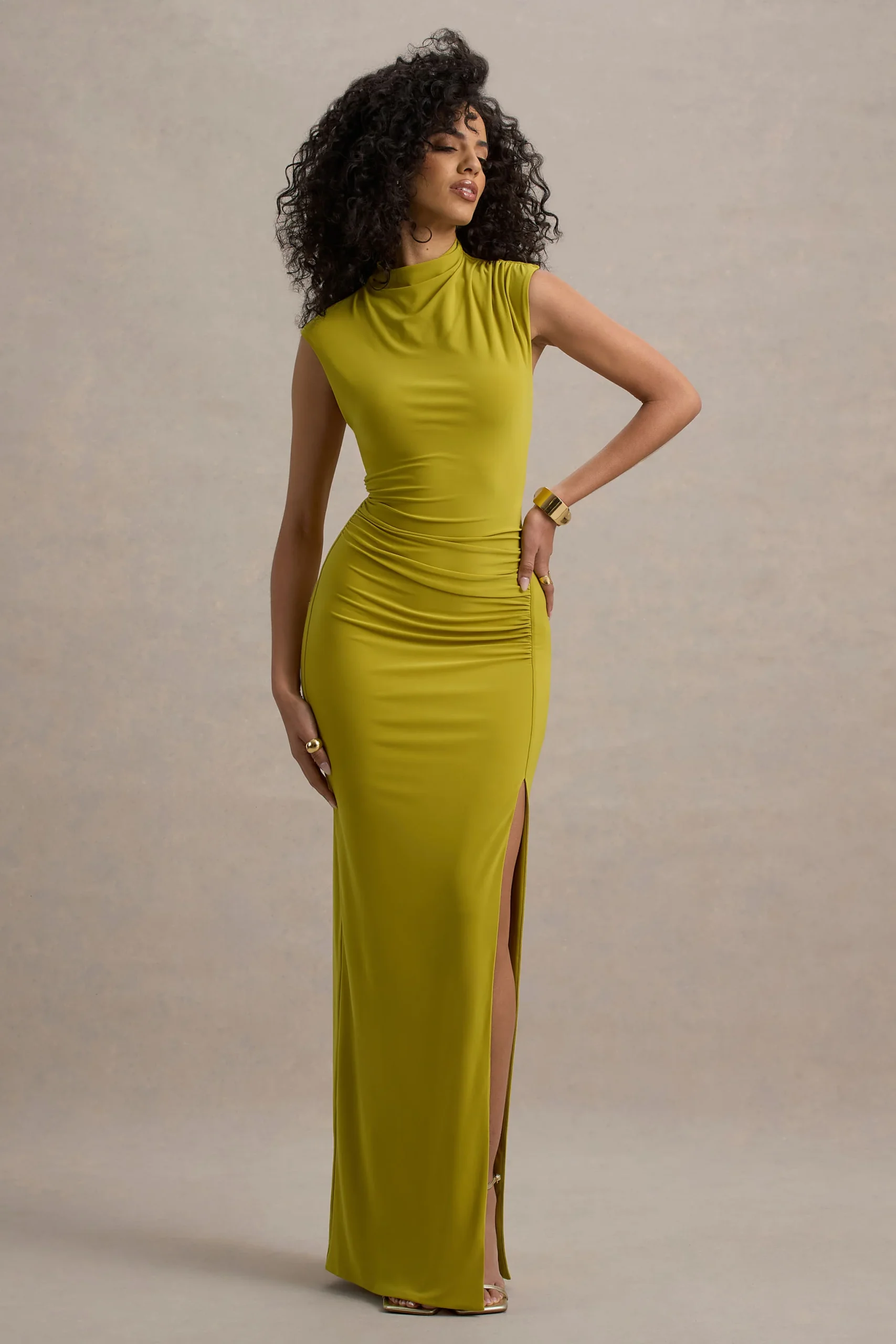 Tan halagador como impecable, cautiva desde todos los ángulos en Lanetta. Confeccionado en un tono verde de nuestro jersey premium conocido por sus propiedades elásticas, este realzador de curvas cuenta con fruncidos favorecedores que ajustan tu silueta natural. Su encanto se ve aún más potenciado por un delicado escote alto recogido y una seductora abertura en la pierna que te asegurará todas las miradas en tu próximo evento.