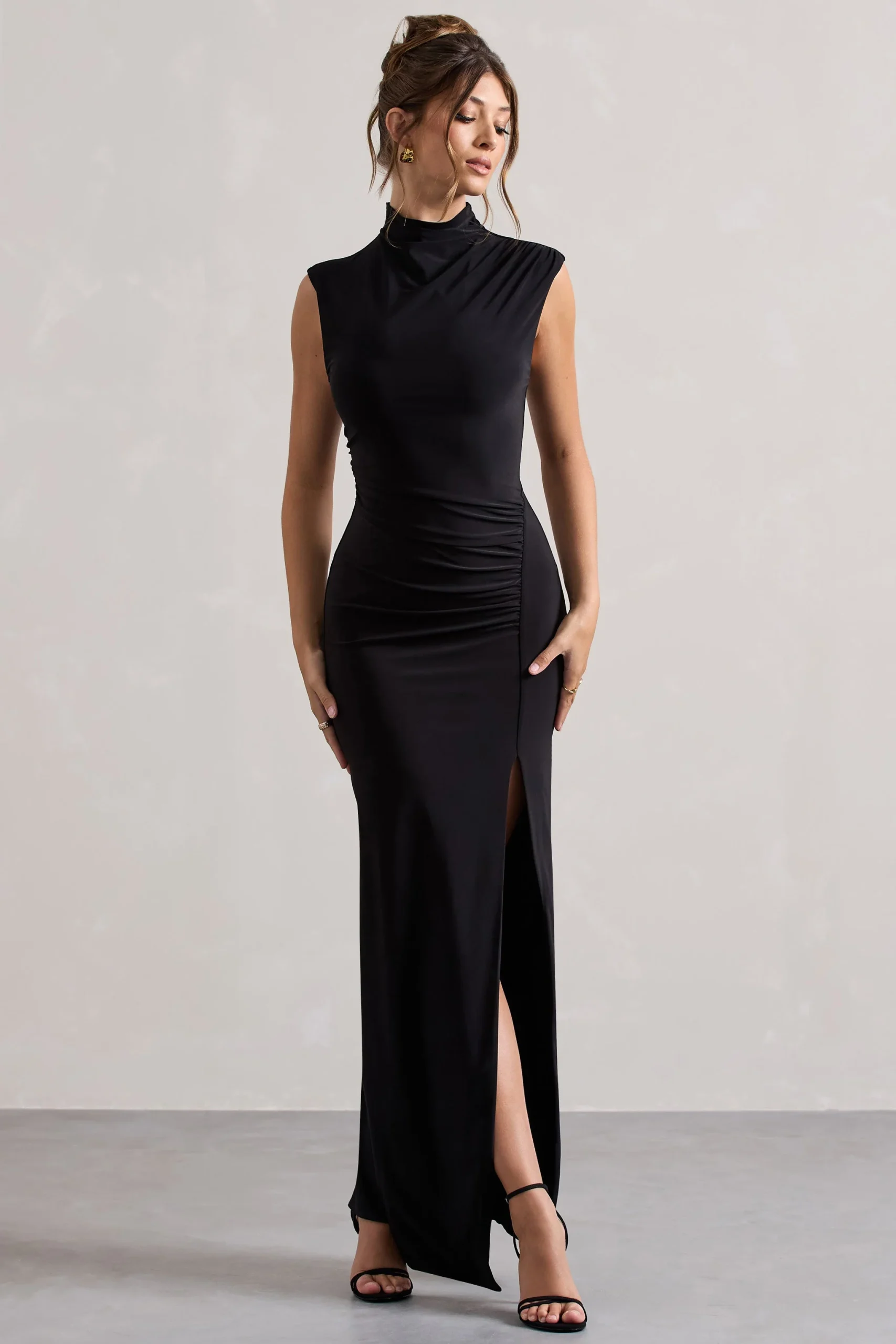 Tan favorecedor como impecable, cautiva desde todos los ángulos con Lanetta. Confeccionado en un tono negro clásico de nuestro jersey premium conocido por sus propiedades elásticas, este realzador de curvas cuenta con fruncidos favorecedores para ceñir tu silueta natural. Su encanto se ve aún más realzado por un delicado cuello alto drapeado y una sensual abertura en la pierna que seguro atraerá todas las miradas en tu próximo evento.
