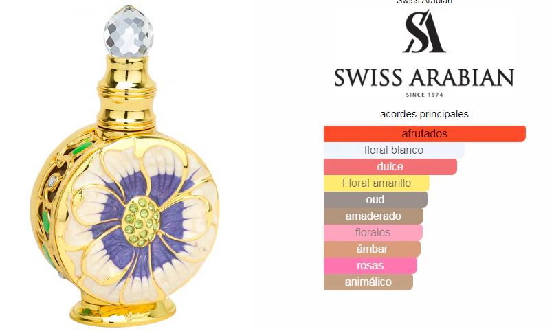 Layali de Swiss Arabian es una fragancia de la familia olfativa Floral Frutal para Mujeres. Las Notas de Salida son ciruela, grosellas negras y flor de azahar del naranjo; las Notas de Corazón son ylang-ylang, rosa y jazmín; las Notas de Fondo son madera de oud y ámbar. TESTER NUEVO SIN USAR