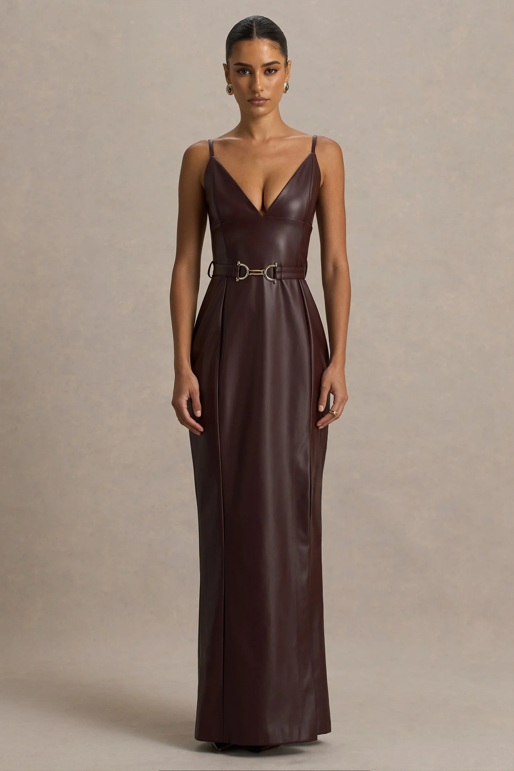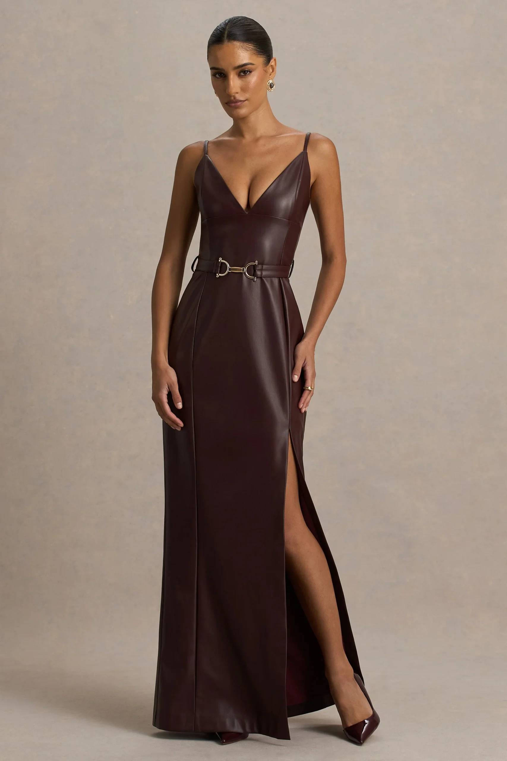 Llama la atención con Lila, una prenda seductora diseñada para cautivar en cada lugar al que vayas. Confeccionado en nuestro exclusivo cuero sintético premium en un rico tono burdeos, este vestido maxi abraza tus curvas de manera espectacular. Diseñado con un escote pronunciado para un acabado femenino y tirantes ajustables para un ajuste perfecto. Un detalle de cierre dorado realza la cintura, mientras que la abertura frontal hasta el muslo añade el toque justo de dramatismo. Combina Lila con accesorios dorados para completar el look.
