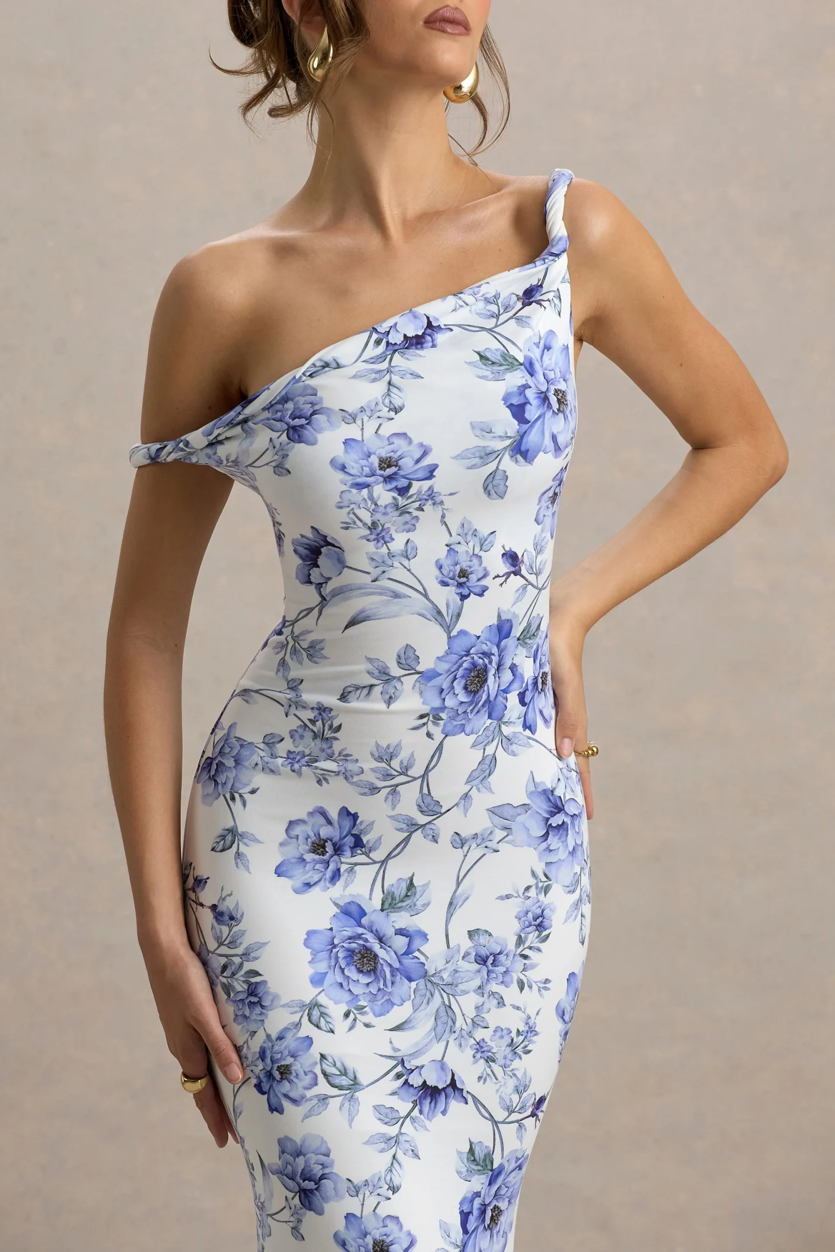 El imprescindible vestido largo de la temporada es Lita. Este vestido ha sido confeccionado con un estampado floral azul de nuestro tejido de jersey elástico de primera calidad que se ajusta a cada curva. Con un escote asimétrico con tirantes enrollados, combina este básico destacado con un recogido y algunos accesorios dorados para un look clásico.