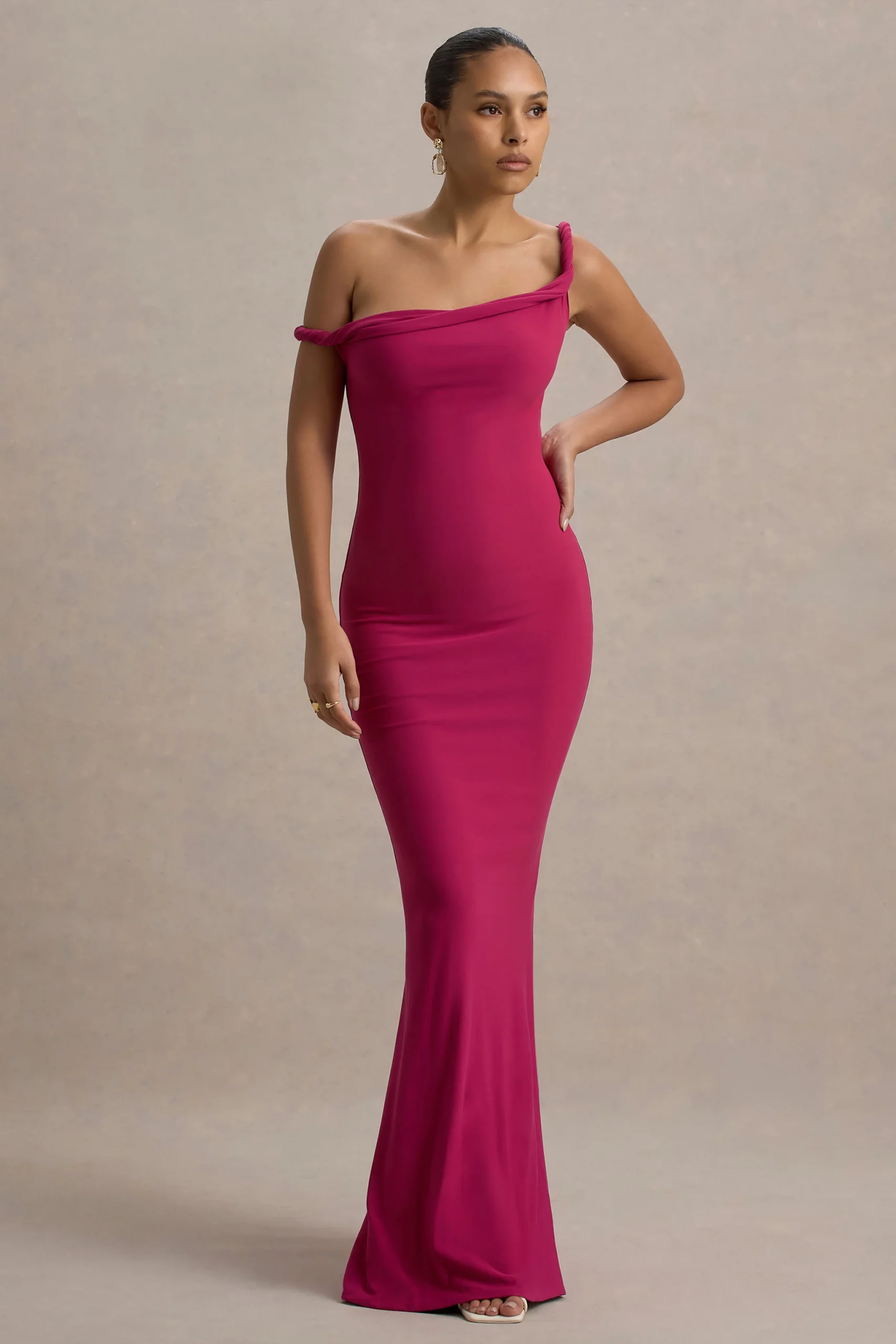 El vestido maxi Lita es una prenda imprescindible de la temporada, confeccionada en un tono rosa fucsia de nuestro jersey elástico de alta calidad que se ajusta perfectamente a cada curva. Cuenta con un escote asimétrico retorcido, lo que le otorga un estilo distintivo.