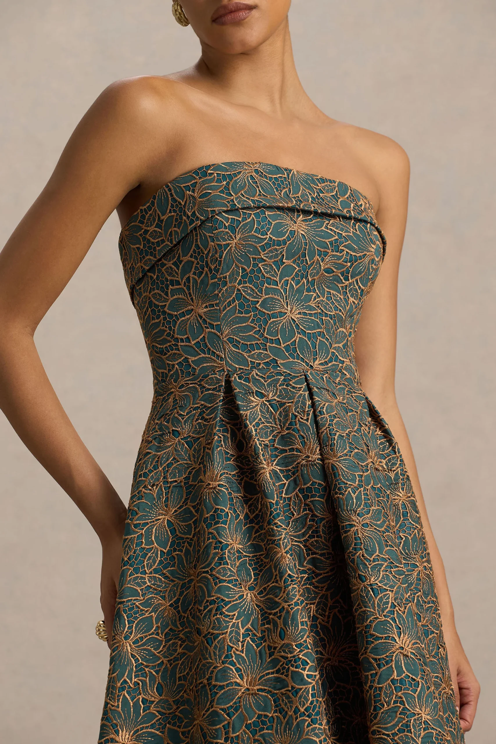 Loretta es el vestido que aporta elegancia atemporal con un toque audaz. Confeccionado en nuestro tejido premium bordado en tonos verde oscuro y óxido, este vestido midi favorece la silueta gracias a sus ricos colores y estructura impecable. El elegante escote bandeau y el corpiño con ballenas esculpen la figura de manera favorecedora, mientras que la falda plisada añade volumen y movimiento elegante. Loretta logra el equilibrio perfecto entre sofisticación y dramatismo, ideal para ocasiones que requieren un look inolvidable.