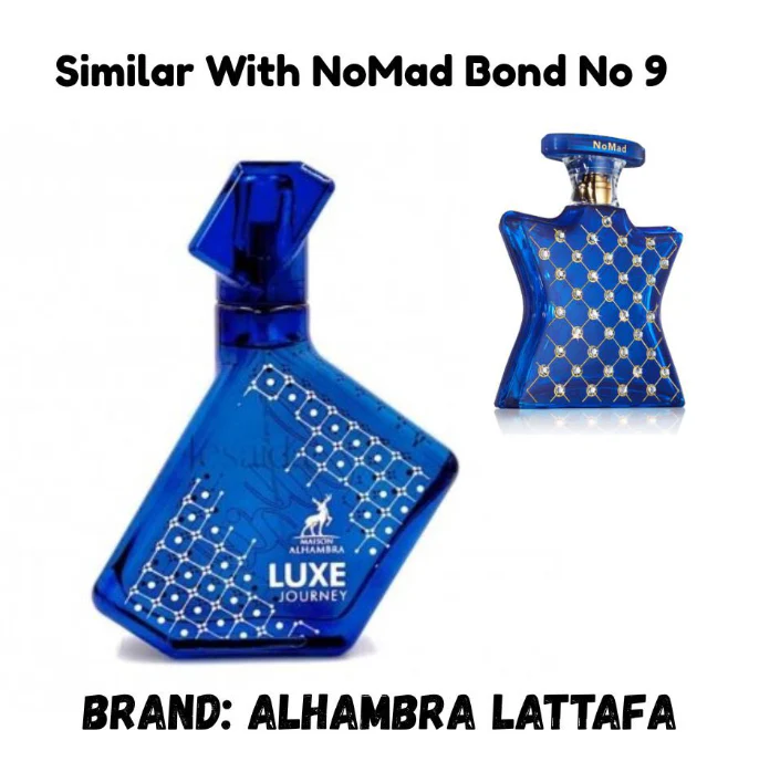 Luxe Journey de Maison Alhambra es una fragancia de la familia olfativa para Hombres y Mujeres. Luxe Journey se lanzó en 2024. Las Notas de Salida son mandarina, casis (grosellero negro) y lichi; las Notas de Corazón son jazmín, azucena y peonía; las Notas de Fondo son almizcle, vainilla, musgo de roble, praliné y ámbar.DUPE Bond No. 9’s NoMad.