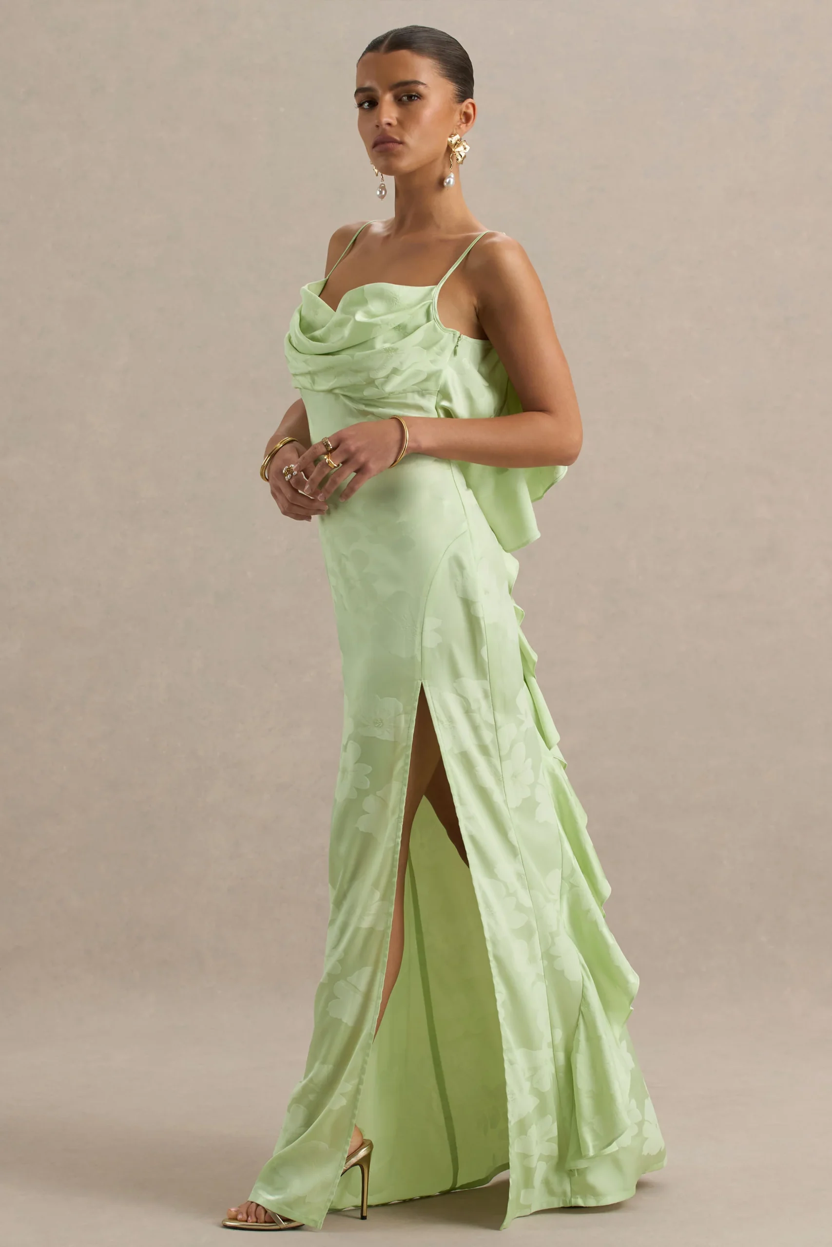 Acapara todas las miradas con Maddie, un vestido romántico que florece con una feminidad audaz. Diseñado con un vibrante estampado floral y confeccionado en nuestro satén de alta calidad, este vestido maxi se mueve con elegancia y encanto. El delicado escote drapeado tipo cowl y los tirantes ajustables crean una caída suave, mientras que la espalda abierta en forma de V aporta un toque sensual. Los detalles de volantes y la abertura frontal alta completan este diseño con un aire atrevido. Combínalo con ondas playeras y sandalias de tiras para un look chic sin esfuerzo.