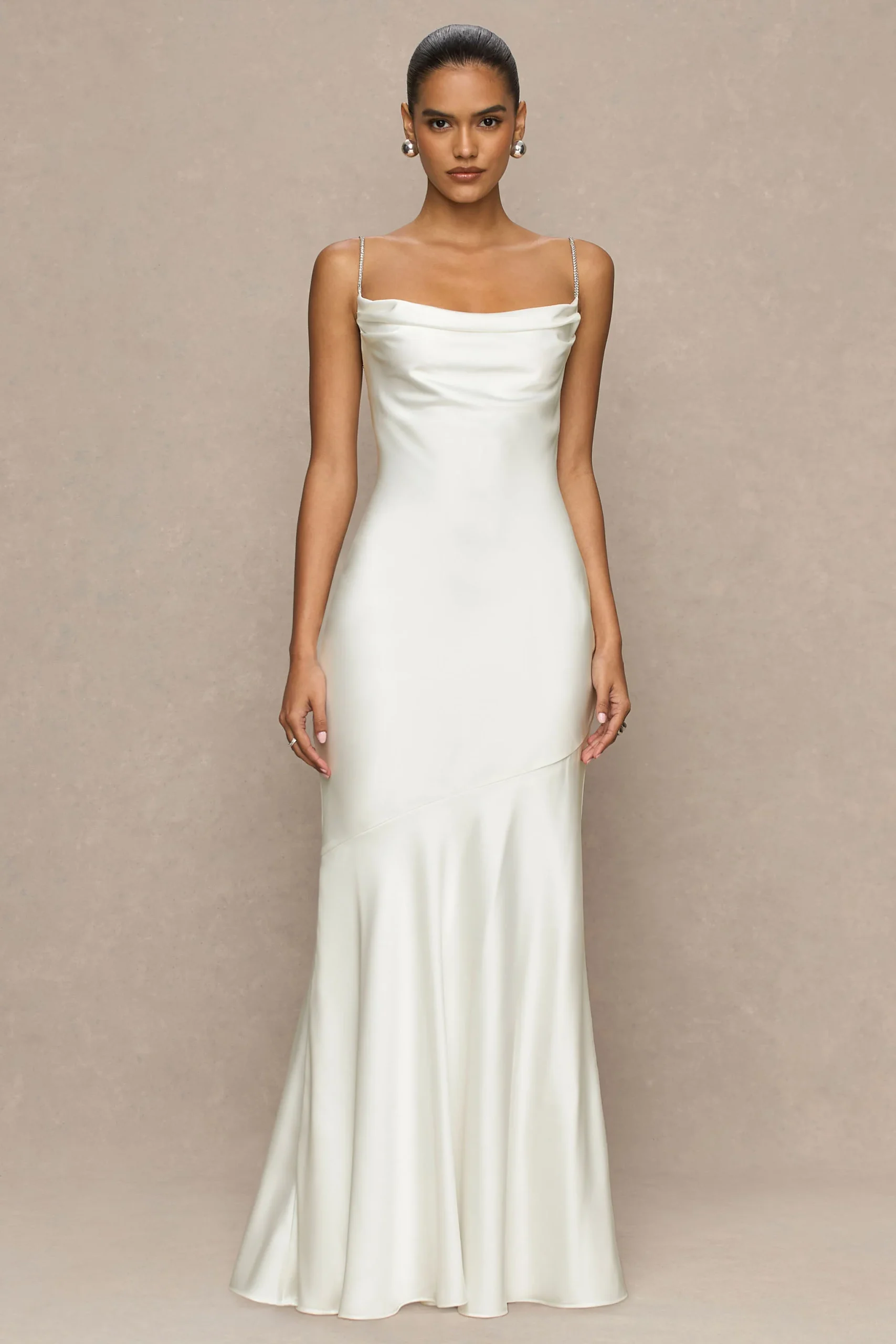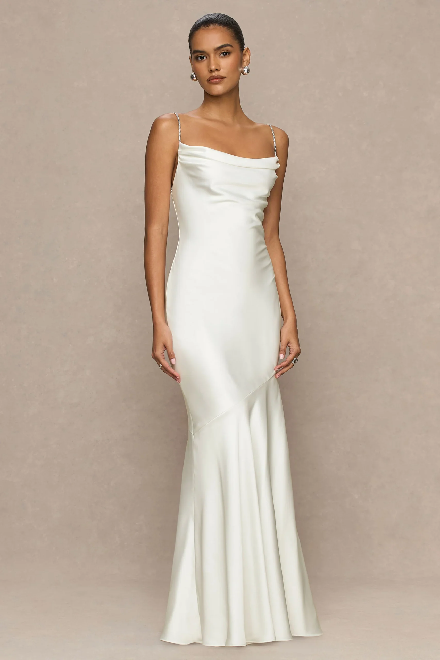 Acapara todas las miradas con Maelia, un vestido que combina sofisticación elegante con detalles brillantes. Confeccionado en nuestro satén premium color crema, cae con naturalidad sobre el cuerpo hasta un elegante largo maxi, reflejando la luz con cada movimiento. Un suave escote drapeado realza el escote, mientras que delicadas tiras adornadas conducen a un espectacular detalle de nudo en la espalda, que se extiende a lo largo de la espalda abierta y cae con gracia hasta el final del vestido. Maelia es una pieza de impacto inolvidable, perfecta para veladas donde la elegancia se encuentra con el encanto.