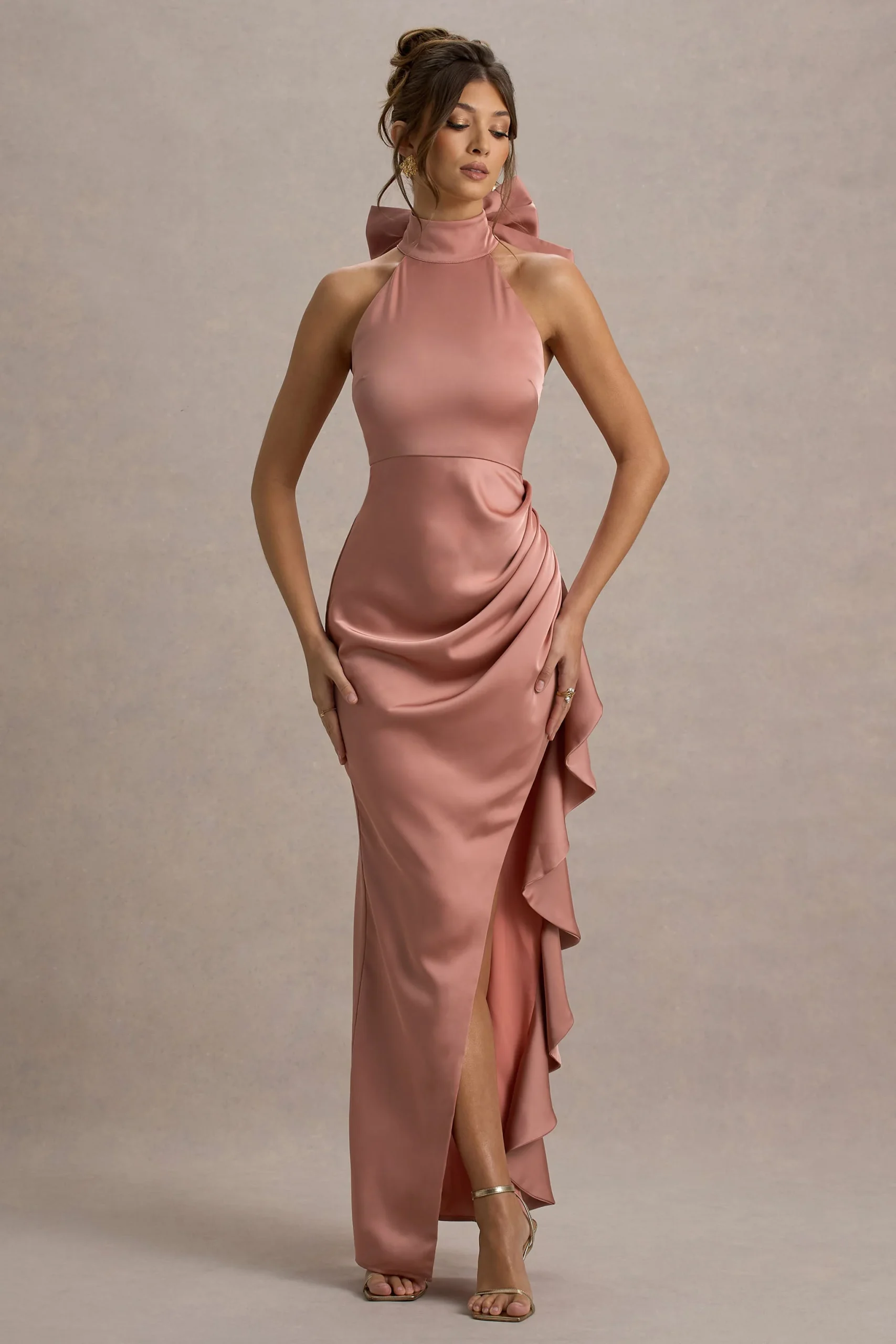 Definido por su sofisticación atemporal y detalles gráciles, Maureen es una opción cautivadora para tus ocasiones más elegantes. Hecho de nuestro satén premium en un elegante tono rosa, este vestido maxi presenta un refinado cuello alto que irradia glamour discreto. El corsé drapeado fluye con facilidad hacia una silueta que esculpe la figura, mientras que una sutil abertura lateral añade un toque de seducción.