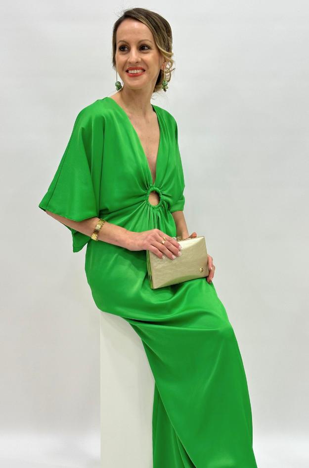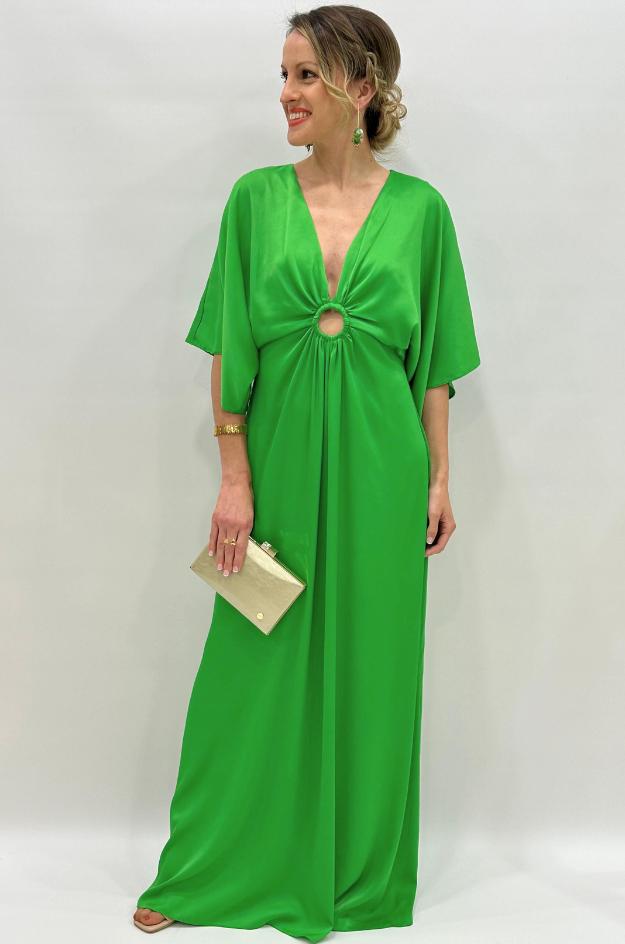 Vestido largo de la marca Casting con un llamativo estampado en tonos verdes y blancos. Diseñado con escote en pico, manga amplia tipo kimono y frunces en el centro realzados por un aro forrado que aporta un toque diferenciador. La espalda incorpora una cremallera invisible que facilita la puesta sin alterar la caída del tejido. Una prenda cómoda, fresca y con mucho estilo.