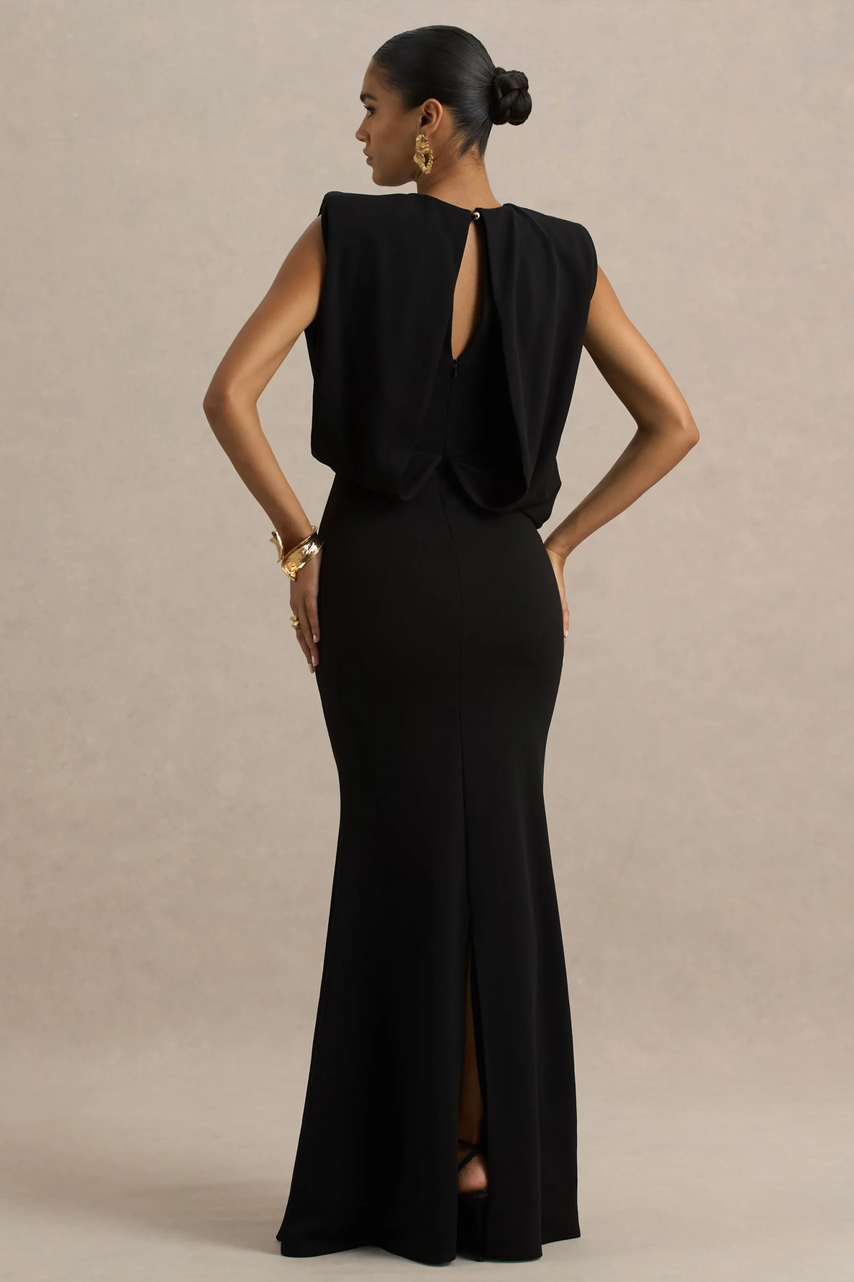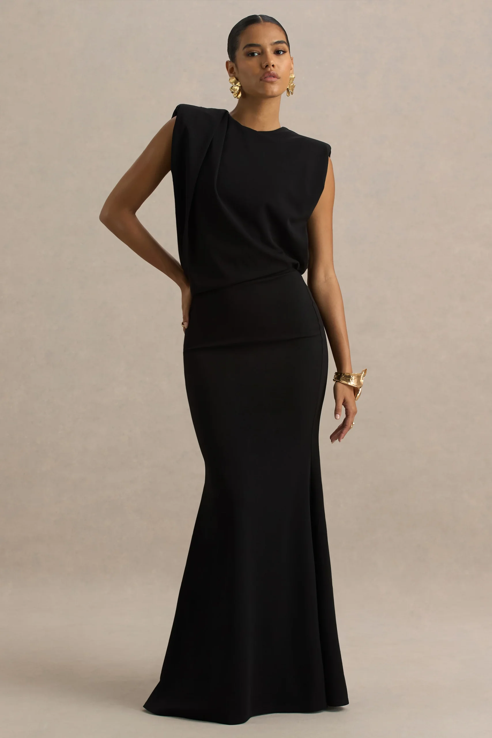 Confeccionado con nuestra lujosa tela de scuba crepé en tono negro, este vestido maxi de impacto está diseñado para momentos inolvidables. Presenta un elegante cuello alto y un cuerpo drapeado tipo blusón, que complementa maravillosamente el acabado estructurado gracias a las hombreras. Meave se realza aún más con una delicada abertura en la espalda tipo lágrima, que aporta un toque de elegancia adicional. Combínalo con tacones y un clutch sofisticado para un look que robará todas las miradas.