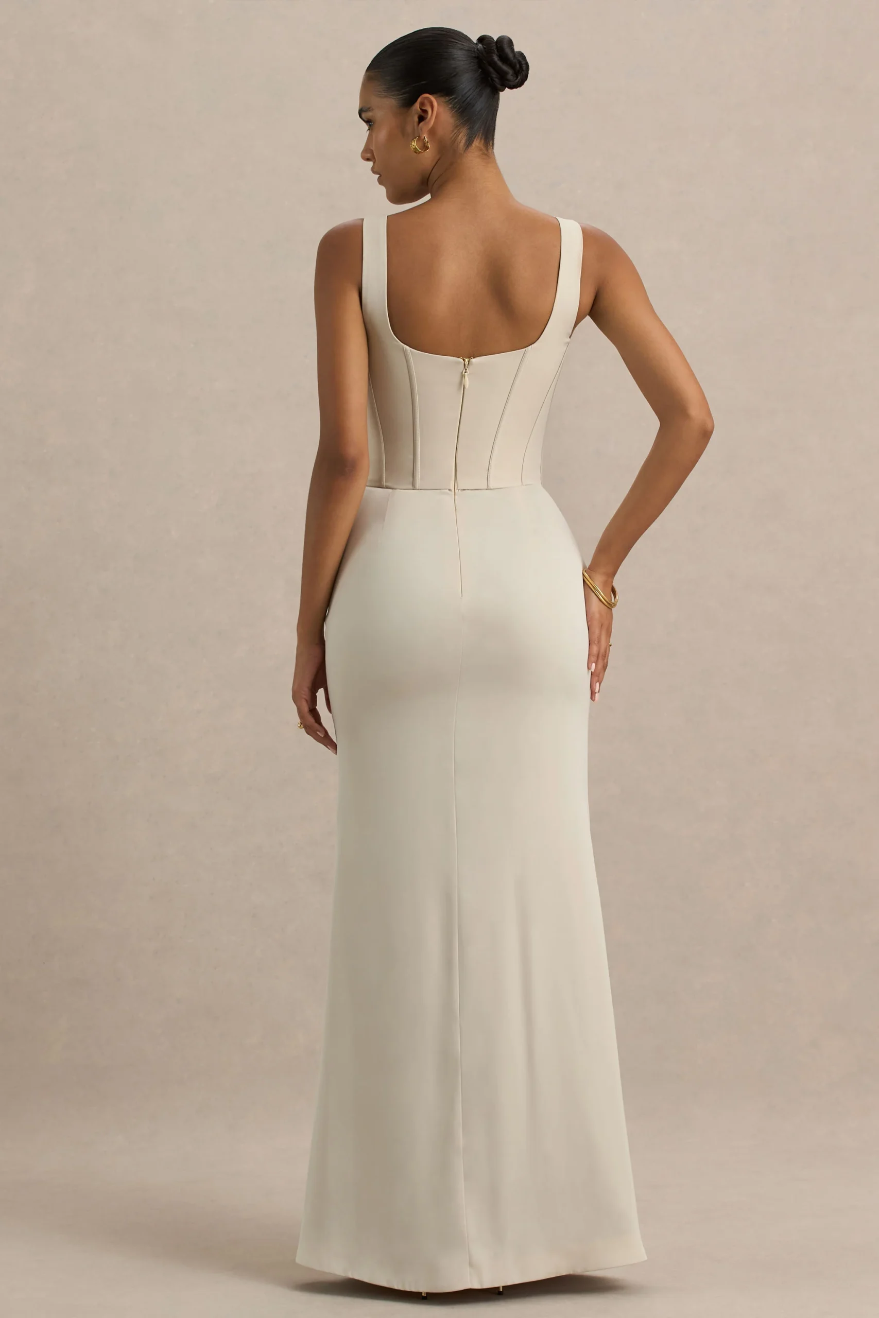 Haz una entrada inolvidable con Morgan, una prenda seductora, esculpida y descaradamente glamurosa. Este vestido largo está confeccionado con nuestro crepé elástico premium y satén de lujo, en un sofisticado tono champán, y está diseñado para favorecer cada curva. Con un corsé estructurado que realza una silueta de reloj de arena y un atrevido escote pronunciado, este vestido irradia elegancia y feminidad. El corsé contrasta maravillosamente con una falda de satén fluida que se mueve contigo con total facilidad.
