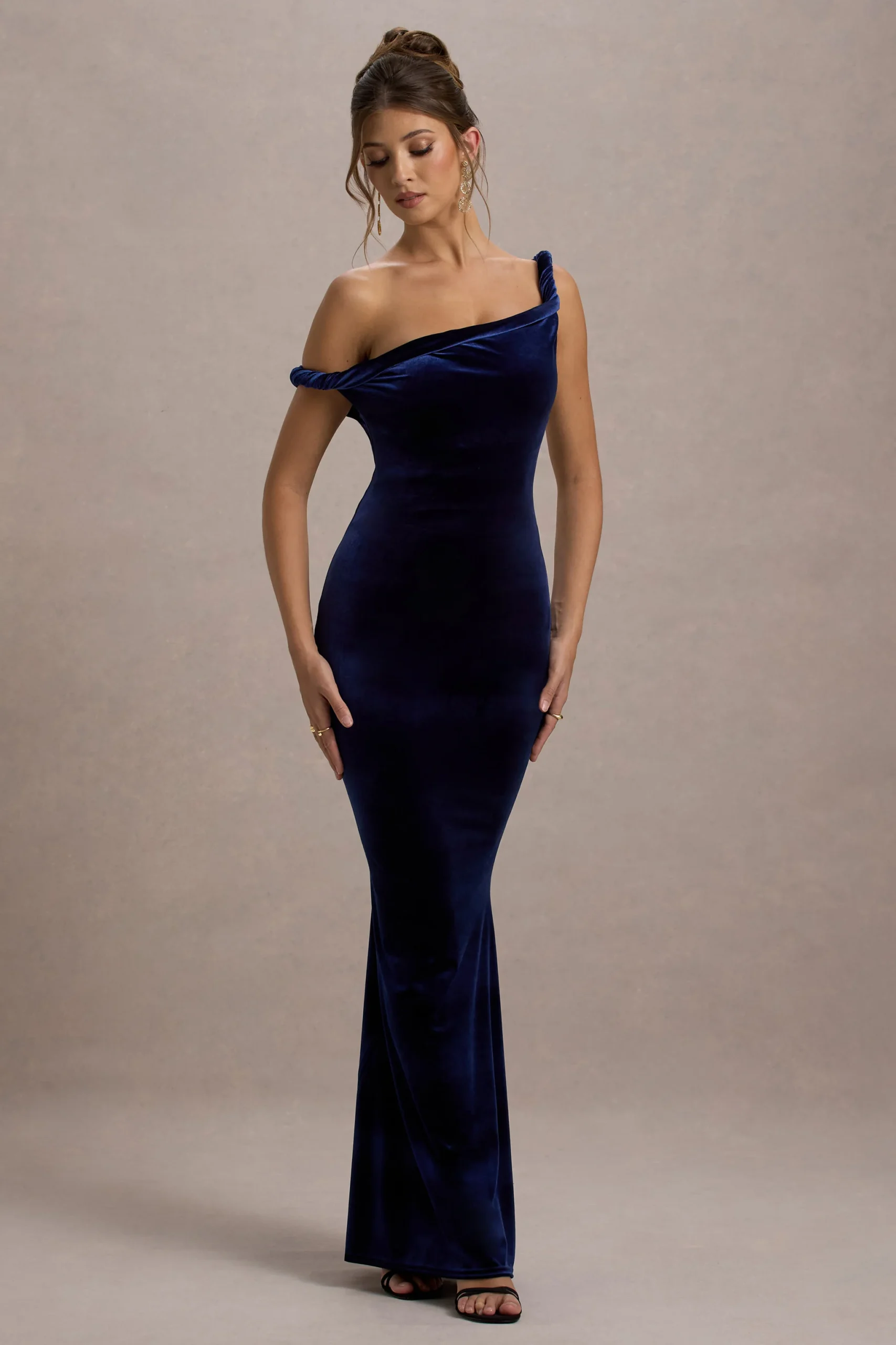Definido por su lujosa tela y diseño audaz, Neeka es una opción inolvidable para tus ocasiones más glamorosas. Confeccionado en nuestro rico terciopelo azul marino, este vestido maxi asimétrico presenta un detalle de torsión en el frente que esculpe tu silueta con facilidad, mientras que el atrevido corte alto en el muslo añade el toque justo de drama. El terciopelo exuberante crea un ajuste impactante que abraza las curvas, y el exclusivo dobladillo asimétrico asegura que te destaques entre la multitud. Mantén a Neeka al frente de tu look combinándolo con tacones puntiagudos y joyería delicada.