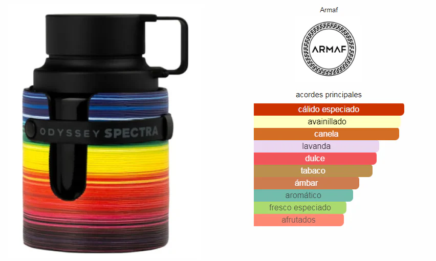 Odyssey Spectra de Armaf es una fragancia de la familia olfativa Oriental Especiada para Hombres y Mujeres. Esta fragrancia es nueva. Odyssey Spectra se lanzó en 2024. Las Notas de Salida son canela, manzana y bergamota; las Notas de Corazón son canela, lavanda, flor de azahar del naranjo y lirio de los valles (muguete); las Notas de Fondo son vainilla, tabaco, haba tonka, ámbar y pachulí.