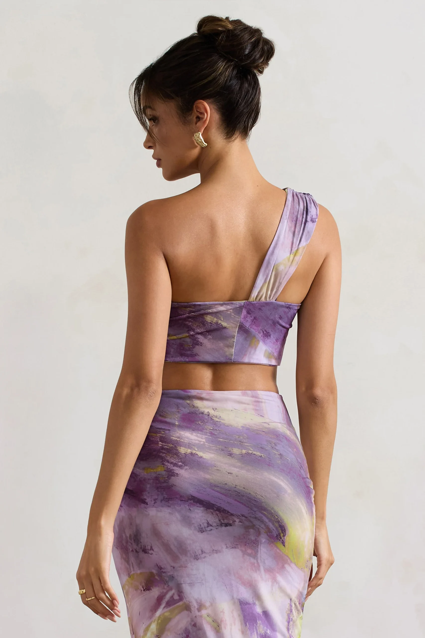 Después de tomar el sol en las playas de Bermudas, necesitarás un impresionante bralette estampado en lila para los cócteles de la tarde. Esta opción asimétrica llamada Open Heart viene en jersey elástico premium con un tirante que se retuerce en la línea del busto.
