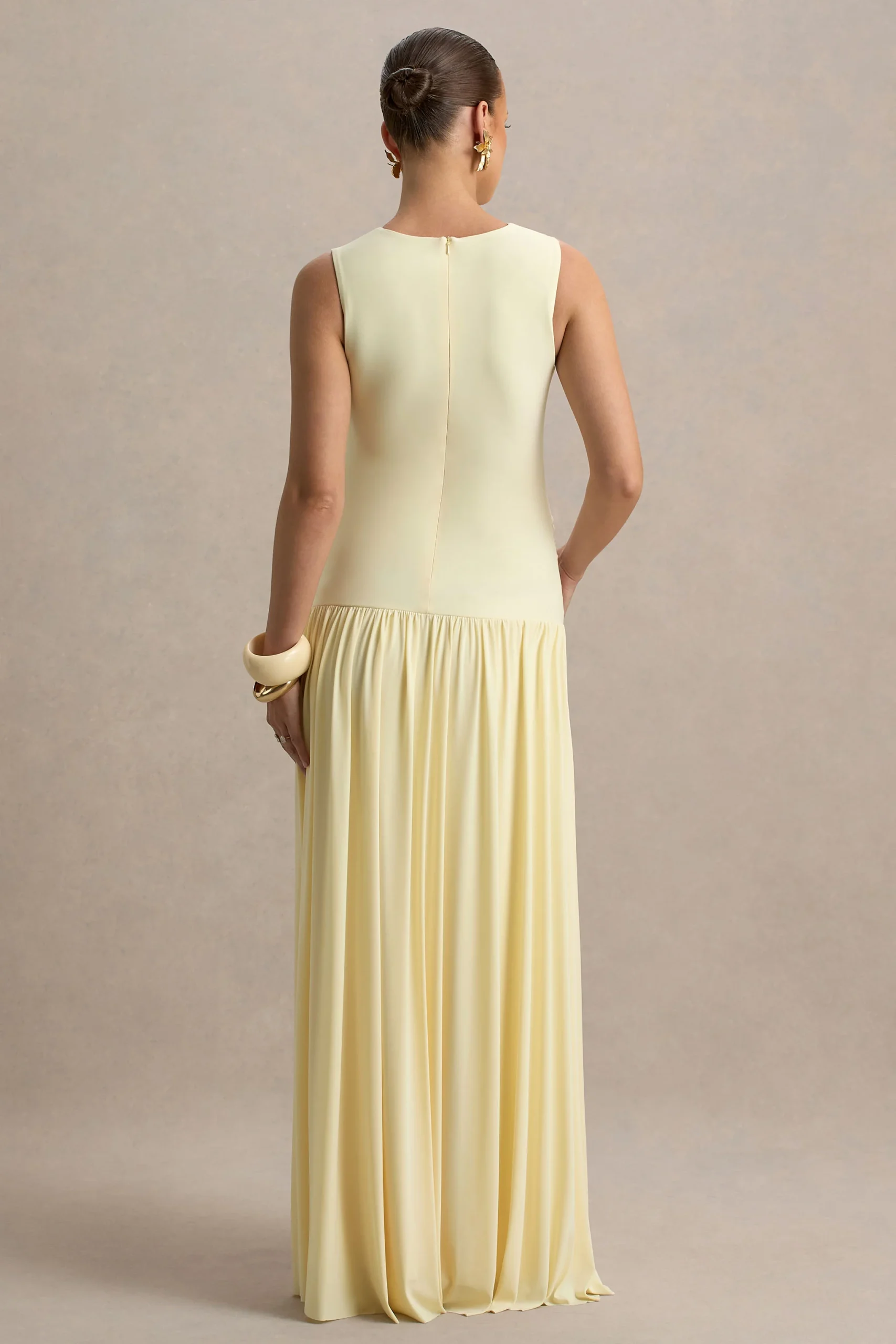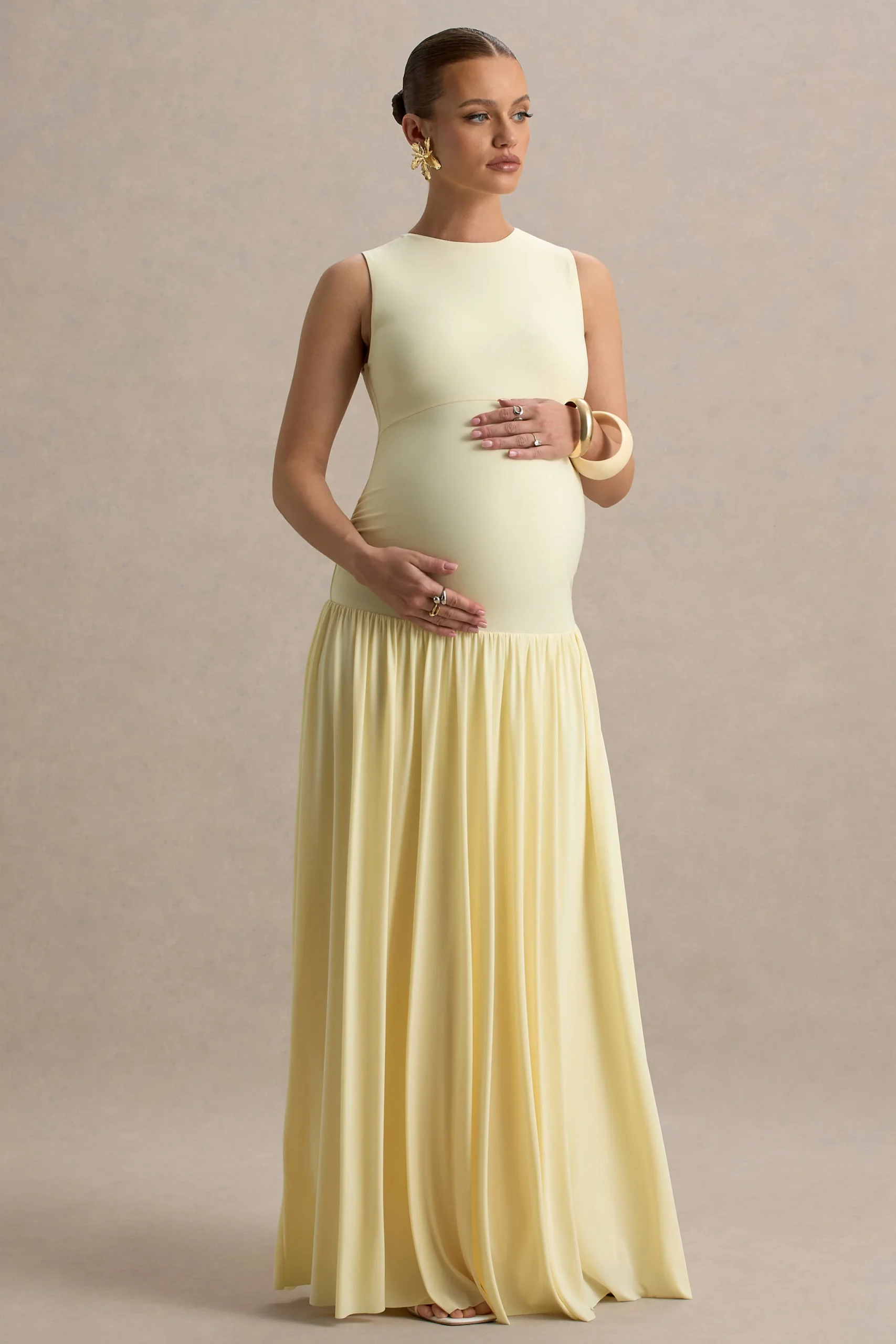Confeccionado con nuestro exclusivo jersey elástico en un tono de limón soñado, esta pieza elegante ofrece tanto comodidad como sofisticación. Cuenta con un elegante escote con abertura y detalles de fruncido colocados expertamente para realzar tu figura. Outline es la pieza perfecta para baby showers, ocasiones especiales y cualquier otro momento elegante en el que quieras sentirte deslumbrante sin esfuerzo.