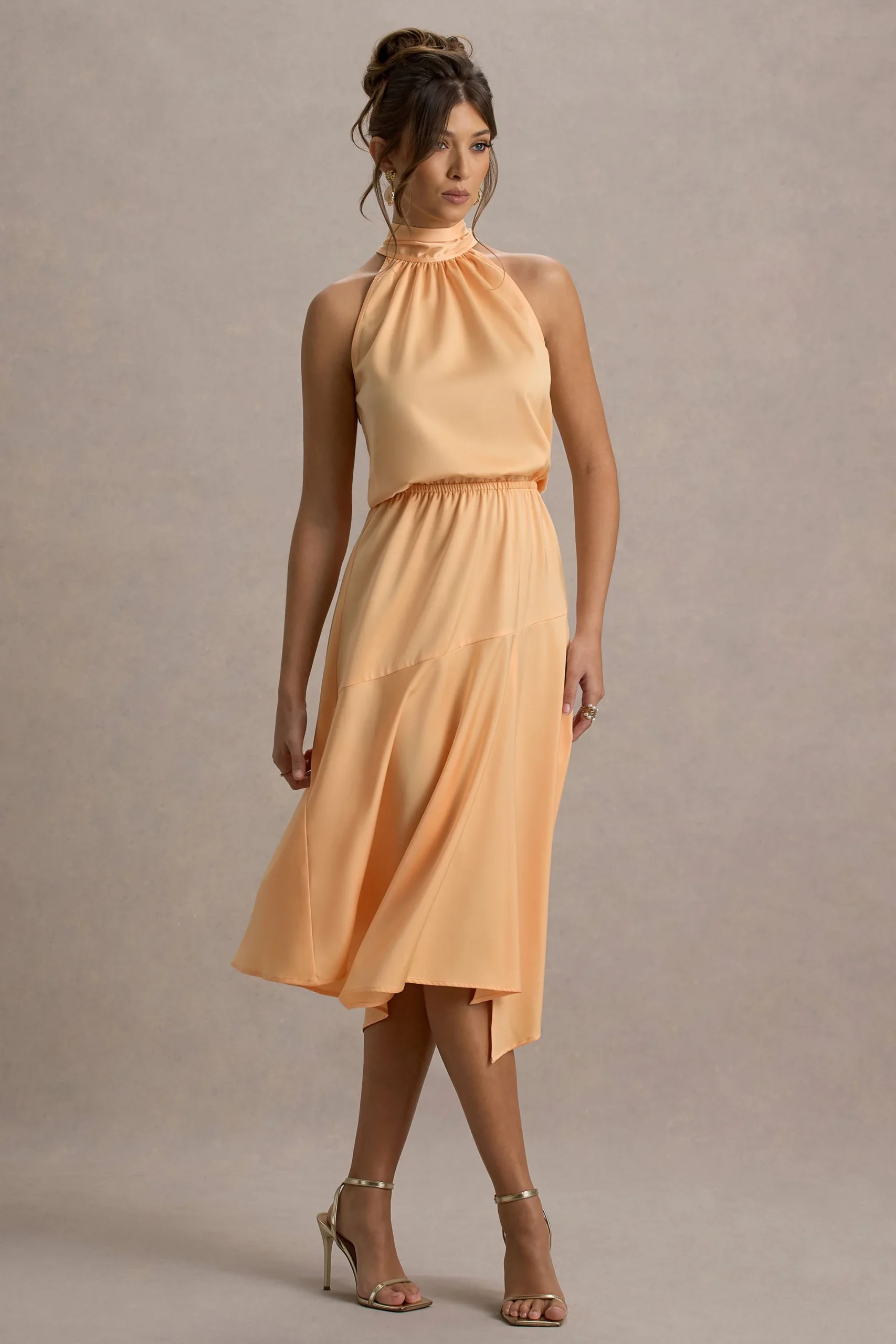 La temporada de eventos pide una prenda impecable como Palonia. Confeccionado en un satén fluido, este vestido midi en tono melocotón irradia elegancia con un cuello alto discreto, tiras autoajustables y una abertura en el dobladillo. Para un look inspirado en fiestas en el jardín, complementa el tuyo con un sencillo moño despeinado y stilettos de tiras.