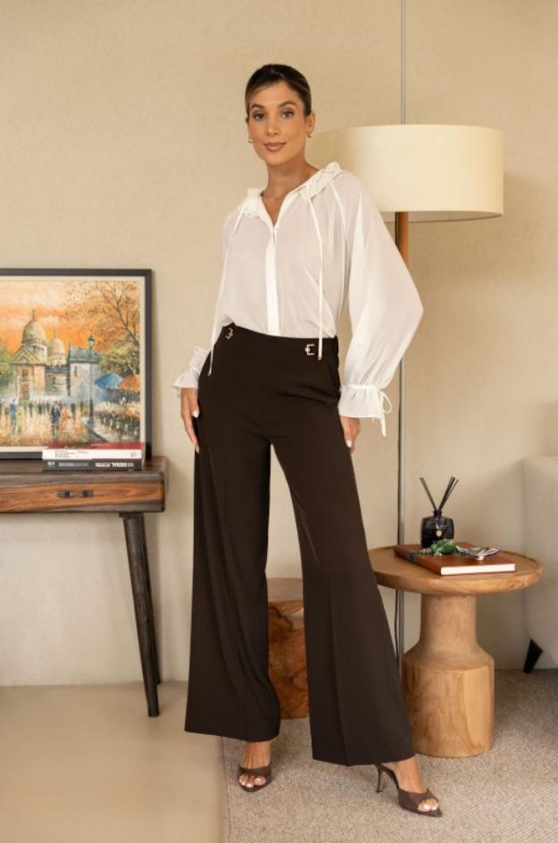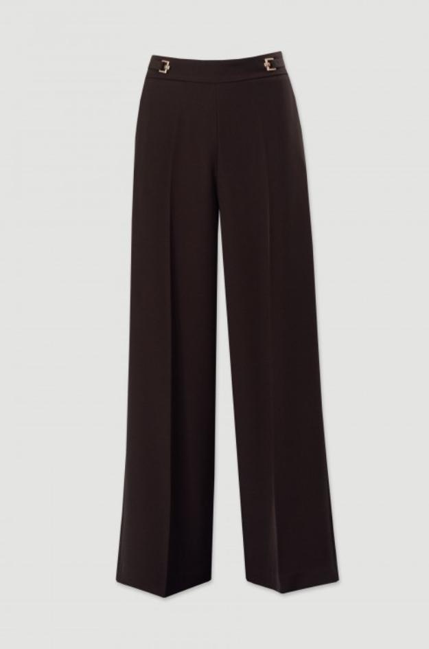 Pantalón wide leg de la marca Ferrache confeccionado en tejido liso de peso medio con caída fluida. Presenta cinturilla alta con trabillas y dos hebillas metálicas doradas en el delantero como detalle. Incluye bolsillos laterales inclinados, cierre oculto (cremallera y botón interior) y pinzas que ayudan a asentar la prenda en la cintura. La pernera ancha y recta cae hasta el suelo, estilizando la figura. Color marrón chocolate uniforme; bajo limpio y terminaciones al tono. Ideal para combinar con blusas o punto fino.