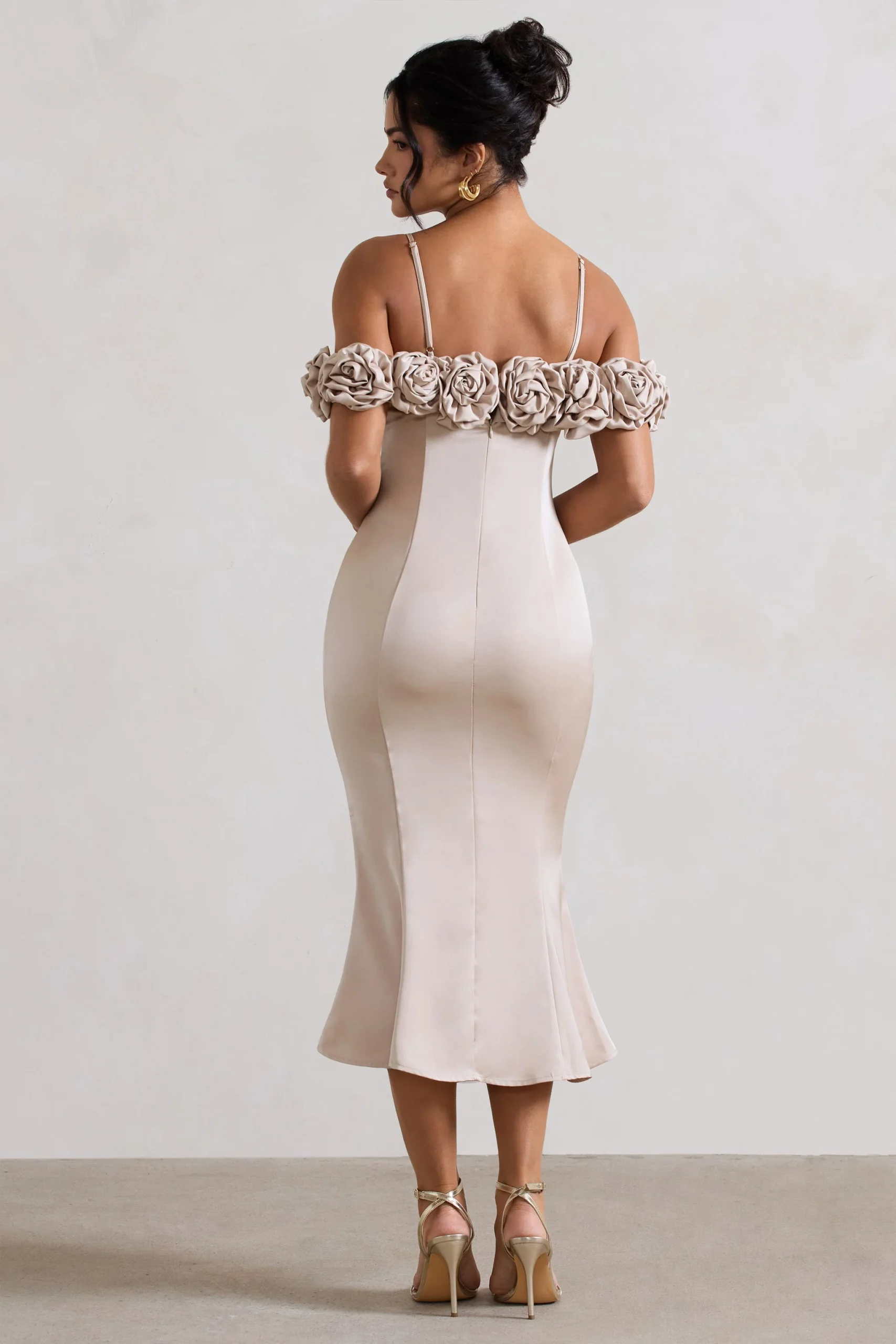 Las ocasiones especiales requieren un vestido especial como Petunia. Expertamente confeccionado en un tejido de satén sedoso, este vestido midi en color champán es una opción femenina para cualquier evento, ya sea una boda de primavera, un cumpleaños o una ceremonia de graduación. Definido por una artística disposición de flores a lo largo de su escote bardot, ¿qué no te va a gustar?