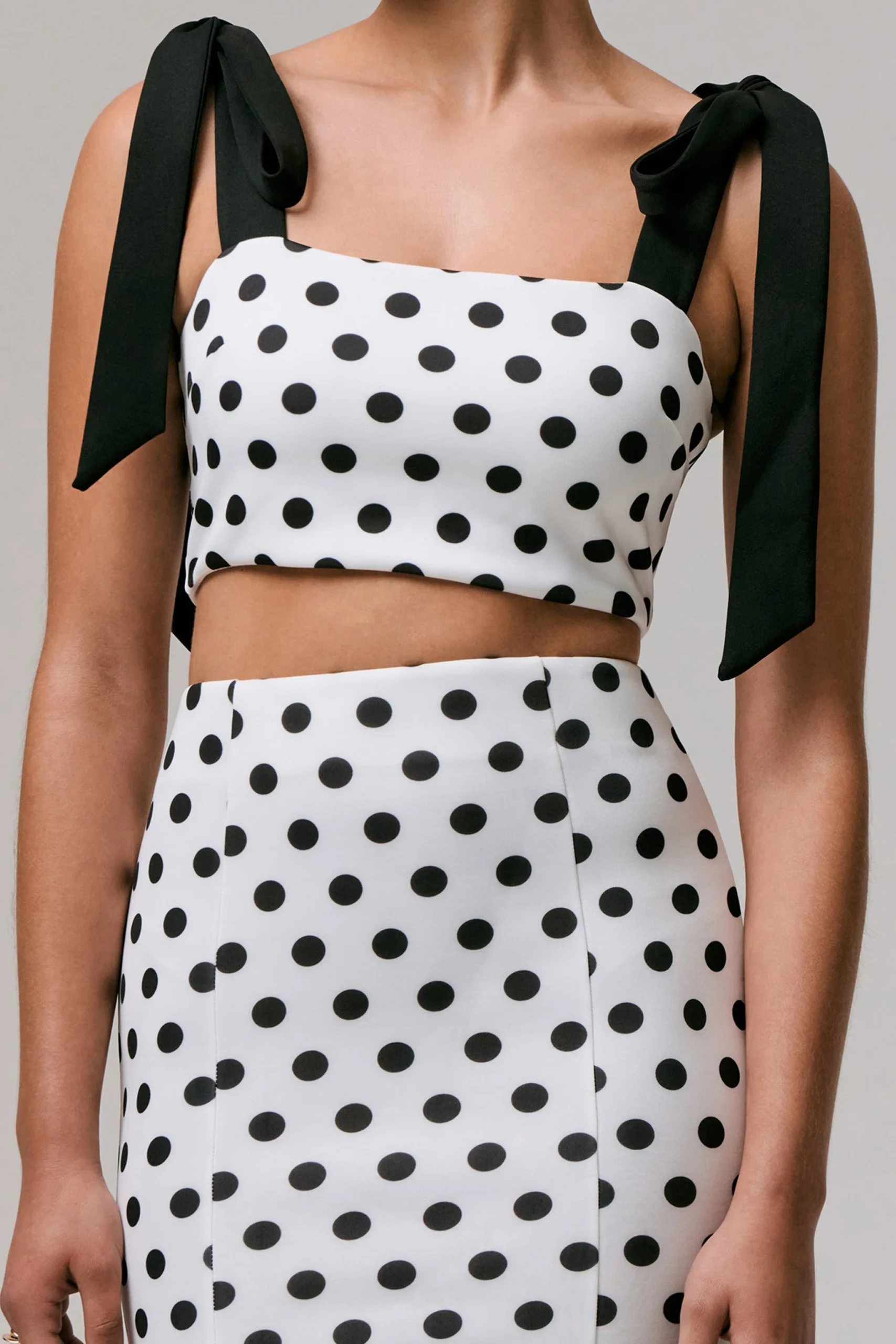 Tu nueva prenda imprescindible para una elegancia sin esfuerzo ha llegado, Phoebe. Diseñada en nuestro exclusivo neopreno y acabada en un atemporal estampado de lunares en blanco y negro. Este top corto estructurado presenta un favorecedor escote cuadrado y mangas con lazo como detalle femenino en el hombro. Coqueto pero refinado, Phoebe combina perfectamente con nuestra falda Amadea para un look que es inconfundiblemente chic.