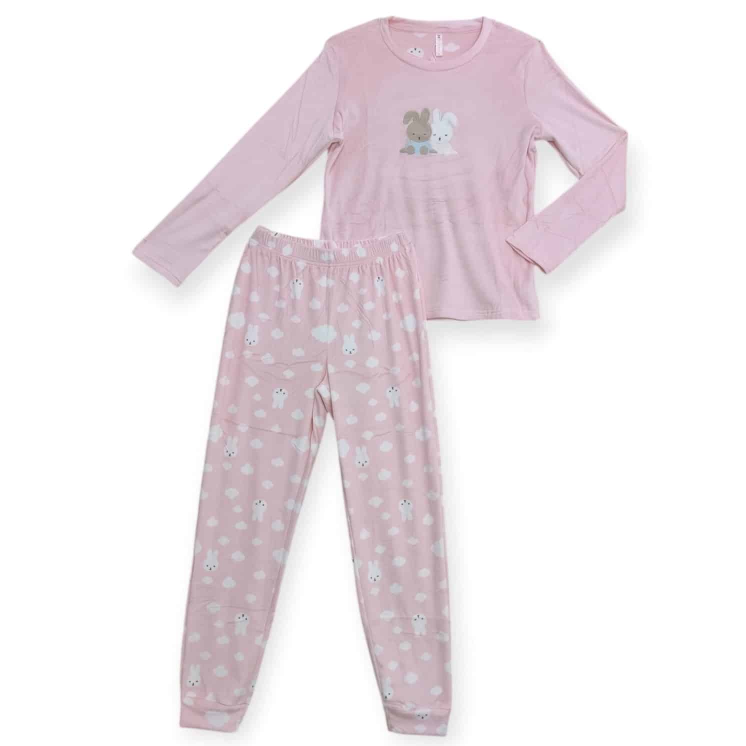 El pantalón, también de color rosa, está decorado con un bonito estampado de nubes y conejos, ideal para quienes buscan un diseño coqueto y alegre. Incluye una cinturilla elástica para un ajuste seguro y cómodo, mientras que los puños en los tobillos ayudan a mantener la calidez durante toda la noche.