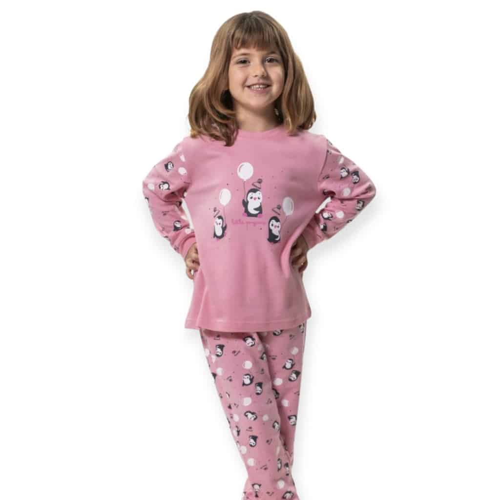La camiseta en color rosa luce un tierno estampado de pingüinos, con manga larga, cuello redondo y puños elásticos, que ofrecen abrigo y un ajuste seguro. El pantalón a juego, también en rosa con estampado de pingüinos, incorpora cinturilla elástica y puños en los tobillos, permitiendo libertad de movimiento y máxima comodidad durante toda la noche.