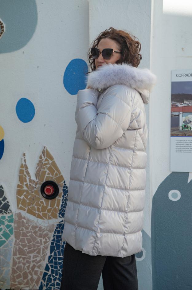 Plumas de la marca GUS en color perla/gris hielo. Presenta corte recto y largo a medio muslo, capucha envolvente con borde de pelo claro y cuello alto. El acolchado a franjas horizontales aporta volumen y abrigo uniforme. Dispone de cierre central de cremallera y bolsillos laterales integrados en las costuras. Manga larga y bajo recto. Acabado con ligero brillo que ilumina el tono claro de la prenda.