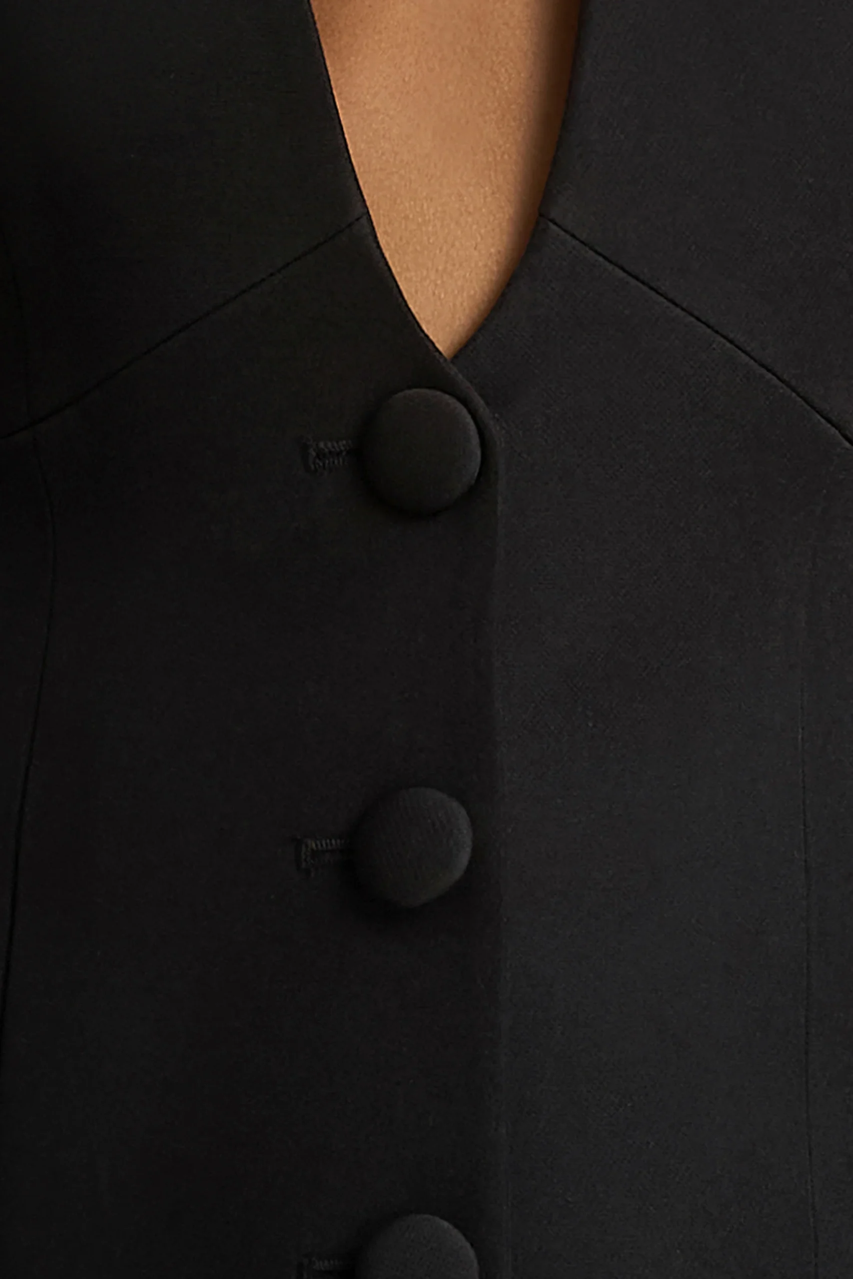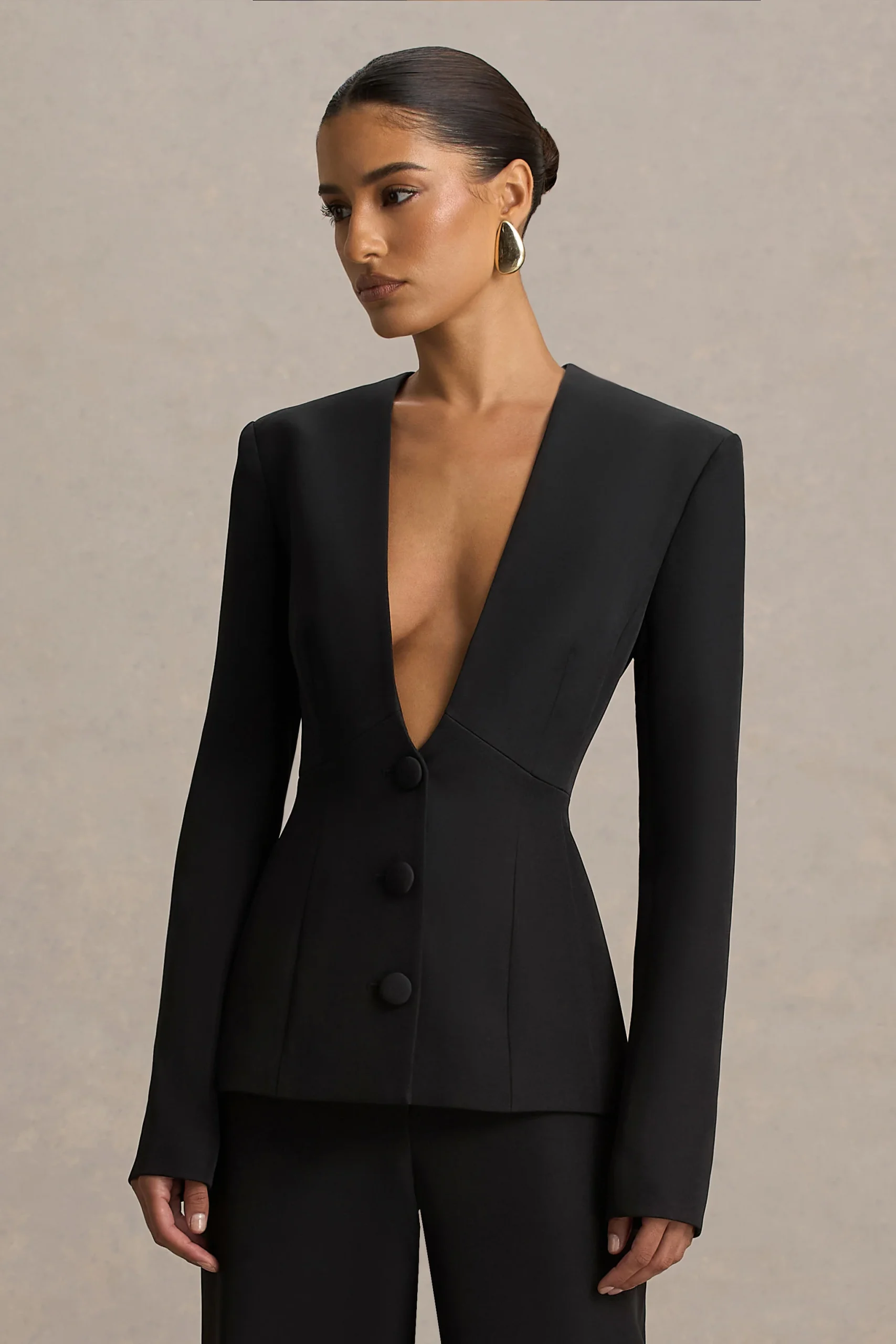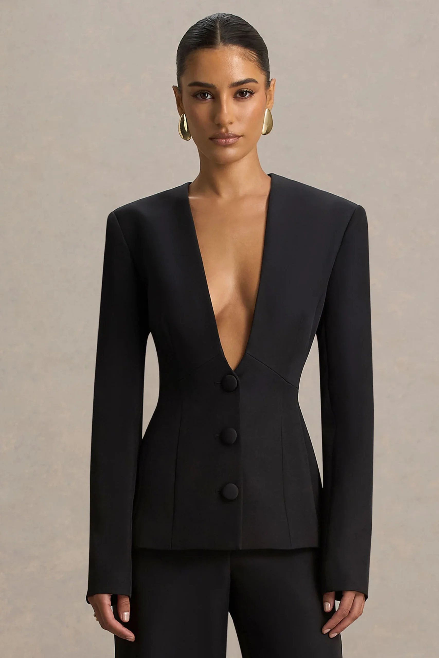 Presentamos Rosalina, una prenda de poder que combina la sastrería impecable con un atractivo femenino. Confeccionada en nuestro crepé elástico premium en un atemporal tono negro, esta blazer de impacto equilibra la estructura con sofisticación sin esfuerzo. Diseñada con un atrevido escote profundo y realzada con hombreras marcadas, capta todas las miradas en cada uso. Rematada con un elegante cierre de botones para un toque pulido, Rosalina es la pieza de layering definitiva para noches que requieren autoridad y estilo.