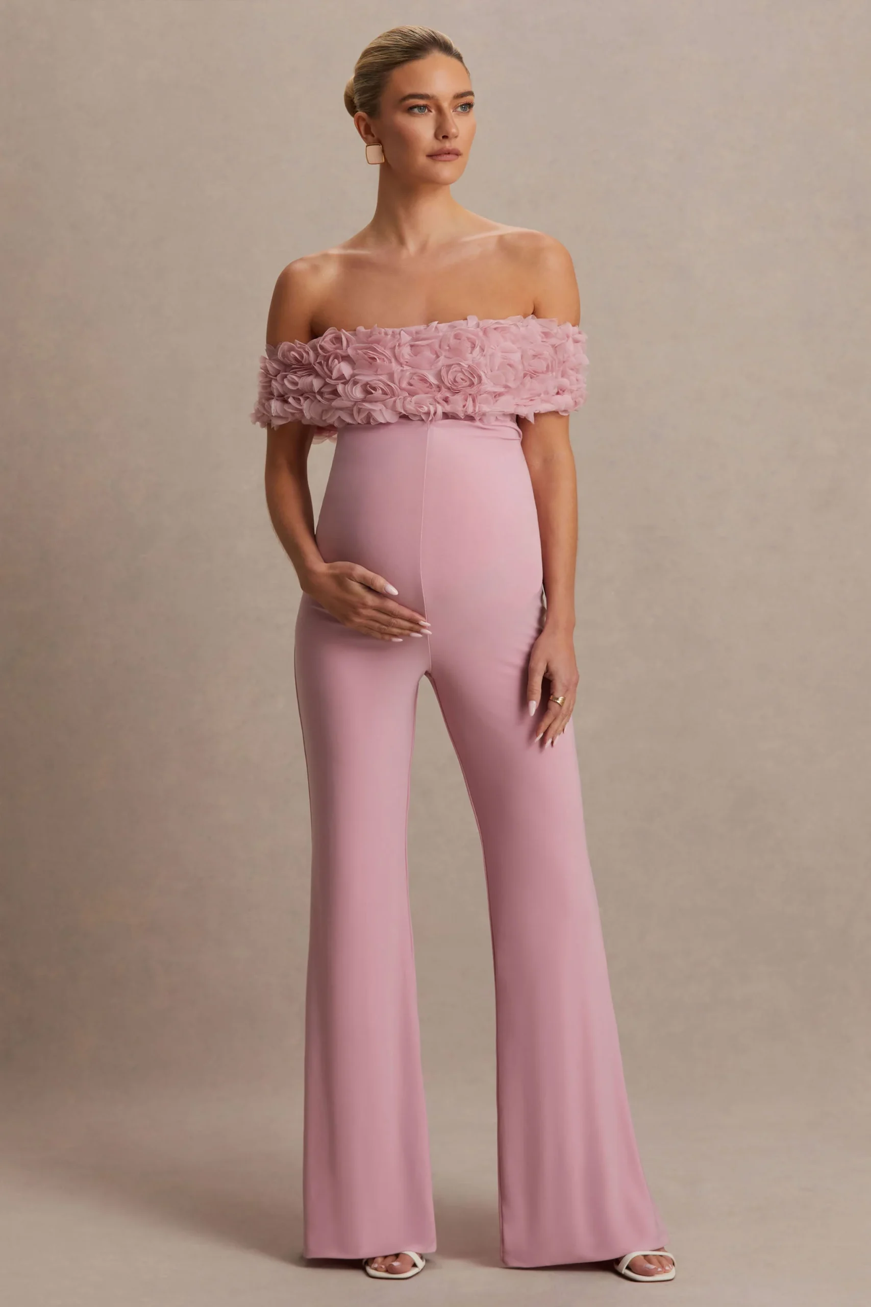 Este mono está confeccionado en un suave tono rosa de nuestro jersey elástico premium, diseñado para realzar tu silueta. El escote bardot enmarca con delicadeza el escote, mientras que el detalle de la flor corsage añade un toque femenino y llamativo. Acabado con fruncidos estratégicamente colocados, esta prenda te favorece desde todos los ángulos. Péinalo con un recogido glamuroso para el look perfecto de baby shower.