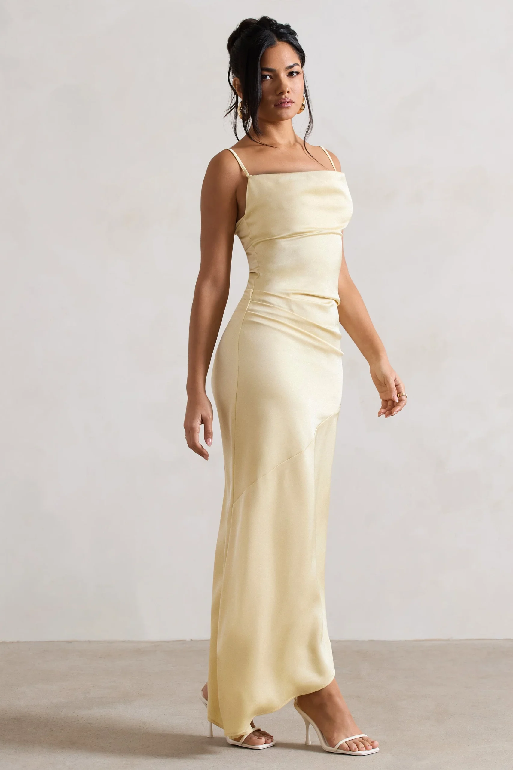 Cortado cuidadosamente en un satén brillante color limón, nuestro vestido largo Santi es la pieza perfecta para ocasiones especiales. Este modelo presenta un escote drapeado y un cuerpo fluido que cae sobre las caderas en una falda asimétrica artística. Combina este vestido con nuestro chal Lush y unos zapatos de tacón de tiras para un look perfecto para una boda.
