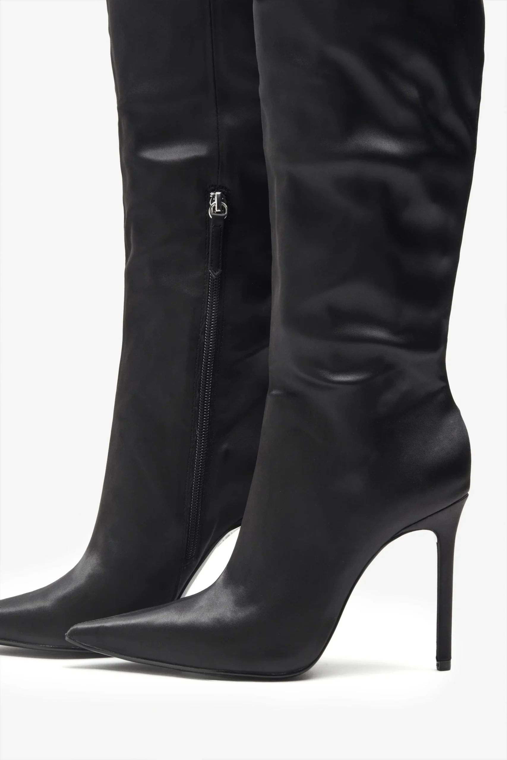Conoce Soho, las botas de tacón favoritas de esta temporada. Envuelto en elegante satén negro, estas botas por encima de la rodilla exhiben un adorno de plumas y una elegante punta fina. Acabadas con suelas ultra suaves y acolchadas que te durarán desde el anochecer hasta el amanecer, Soho es el zapato perfecto para estar listo para la fiesta.