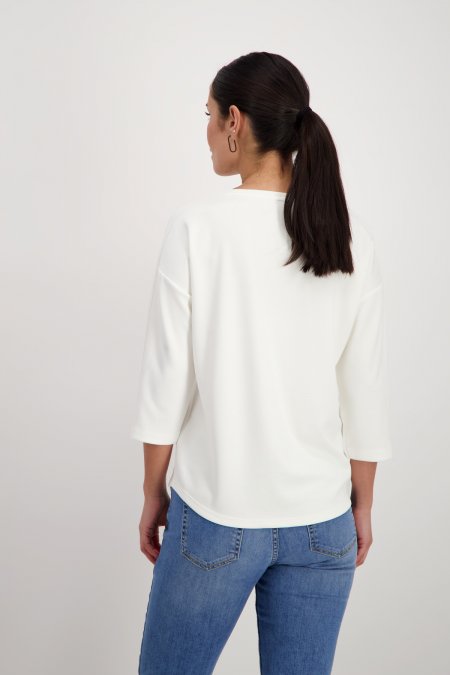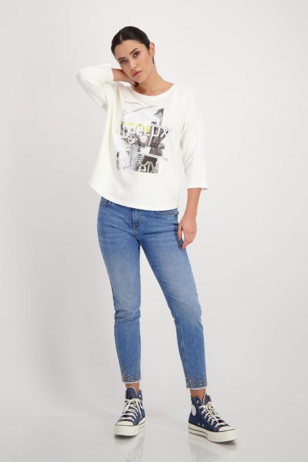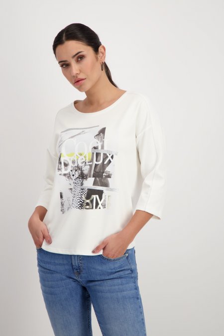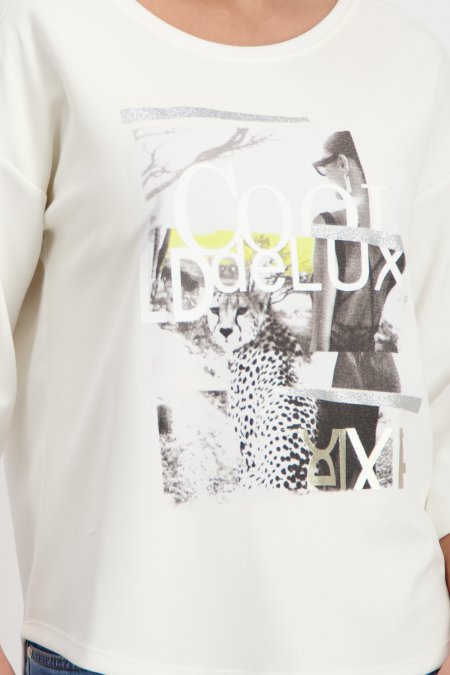 ¡Sudadera de Monari blanca de ajuste regular y tacto suave, confeccionada en mezcla fluida de viscosa! Presenta escote redondo, manga tres cuartos y un llamativo diseño en la parte delantera. Combina un dibujo de mujer y tipografía 3D con un estampado de leopardo, ¡destacando con estilo y originalidad!