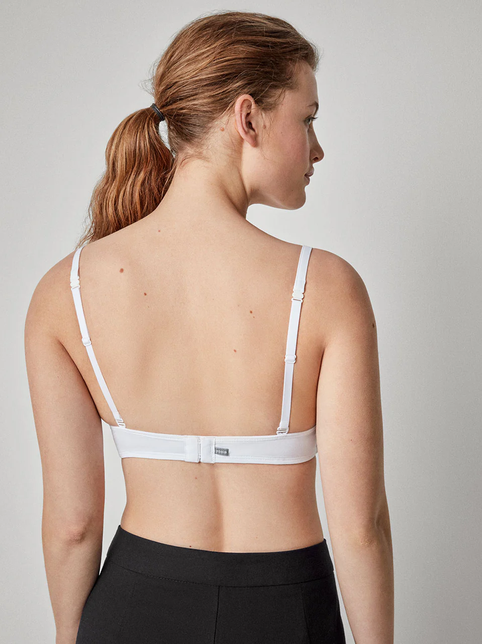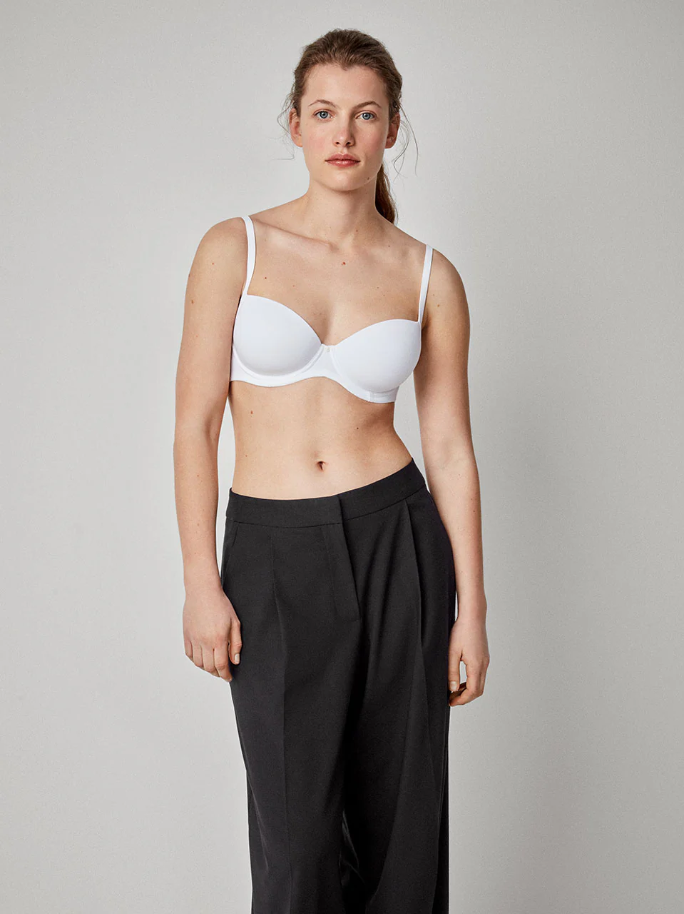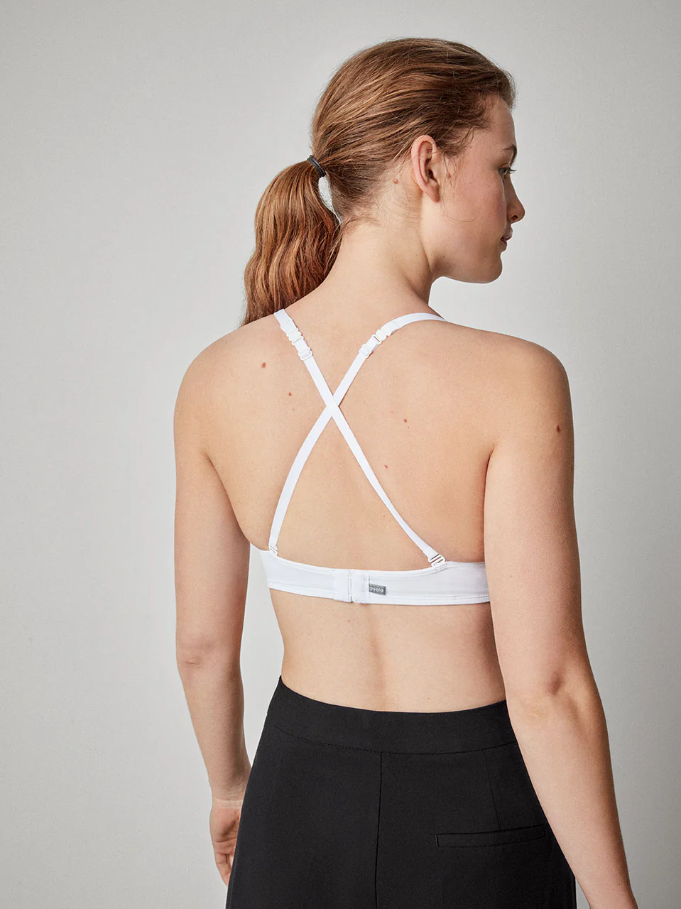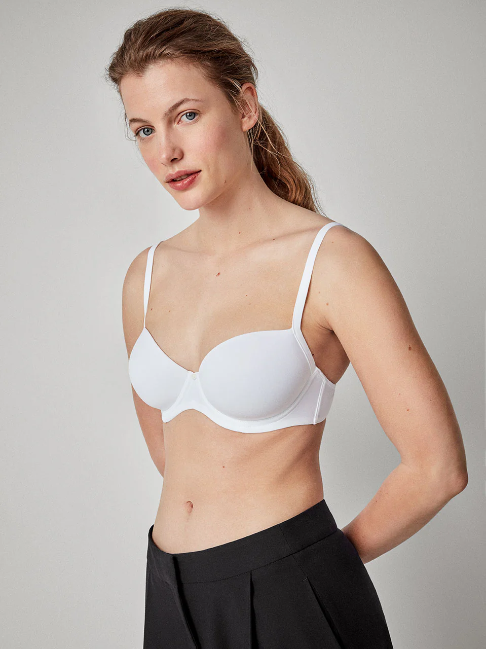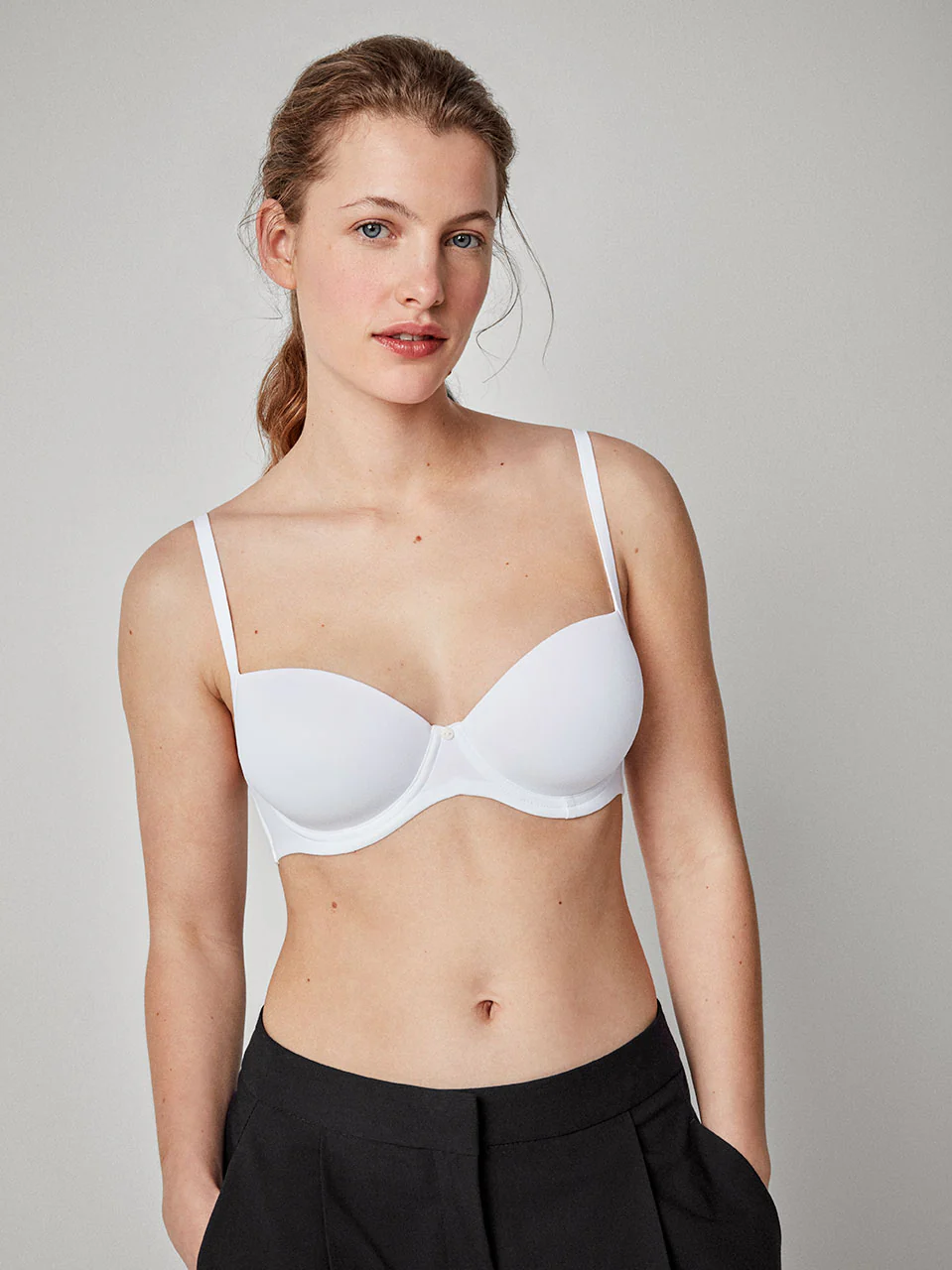 Sujetador capacidad con aro y foam. Tirantes regulables multiposición que incluye enganche para poder cruzarlos. Cierre trasero de 4 posiciones y detalle de botón decorativo en el centro. Disponible en tres colores y en copas C,D y E.