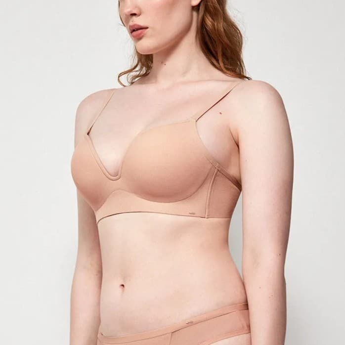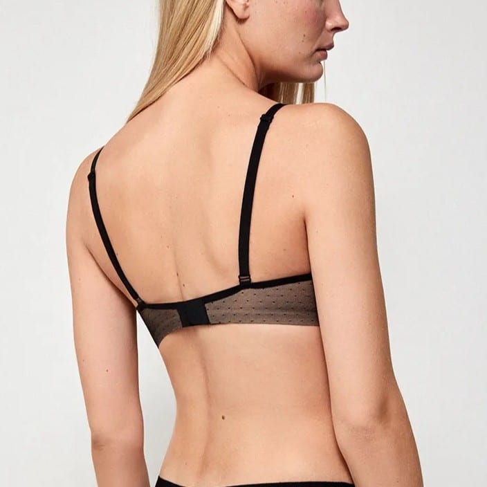 Su diseño es ideal para prendas escotadas, gracias a su estructura ligera y su tejido plumetti delicado y femenino, adherido a una capa de microfibra ultra suave que se adapta perfectamente al cuerpo. Los acabados termofusionados e invisibles garantizan que el sujetador no marque bajo la ropa, ofreciendo una apariencia impecable incluso con prendas ajustadas.