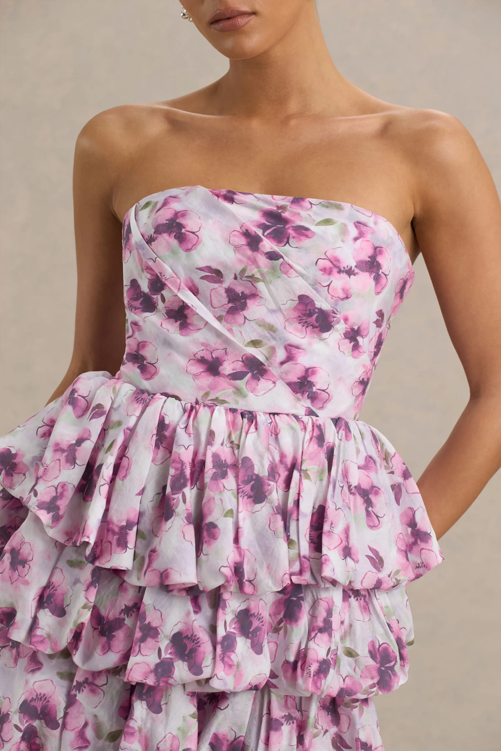 Confeccionado en una delicada organza con estampado floral crema, este vestido mini da vida a un romanticismo etéreo en cada detalle. El escote palabra de honor ofrece un acabado limpio y esculpido, mientras que la falda de volúmenes en capas añade un toque de dramatismo, creando una silueta que no pasa desapercibida. Ya sea disfrutando de cócteles en una fiesta en el jardín o bailando toda la noche, este mini vestido llamará la atención en cualquier lugar.